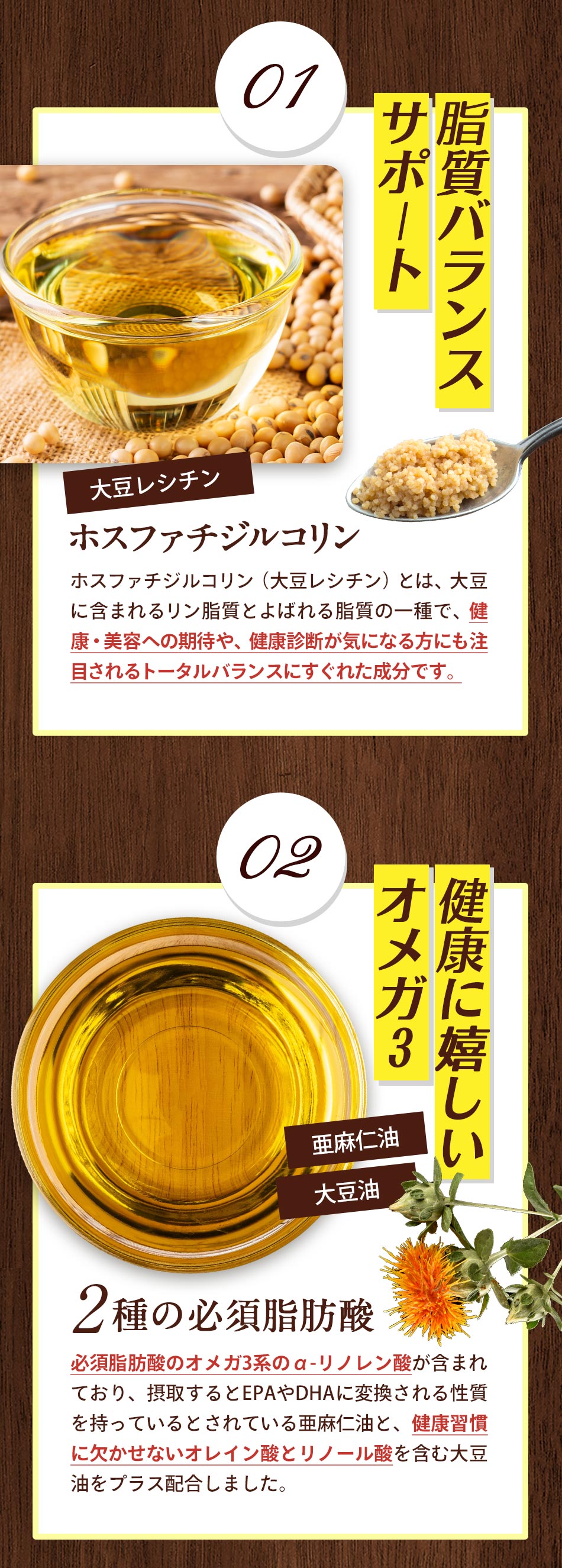 主要原料(1粒あたり):アマニ油 100mg / 大豆レシチン抽出物 66.67mg /大豆油 62.83mg / ガルシニアエキス末 17mg