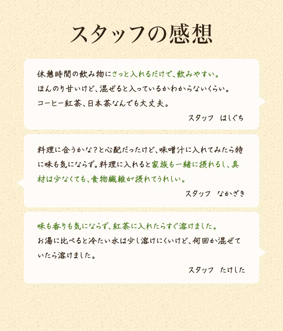 約5g~15g(大さじ1~2杯程度)を目安に飲み物や料理によく溶かしてお召し上がりください。