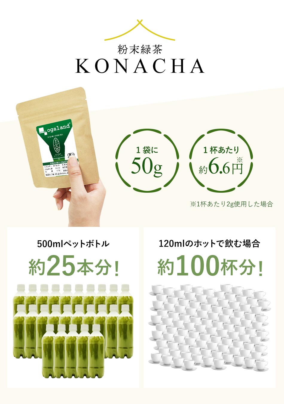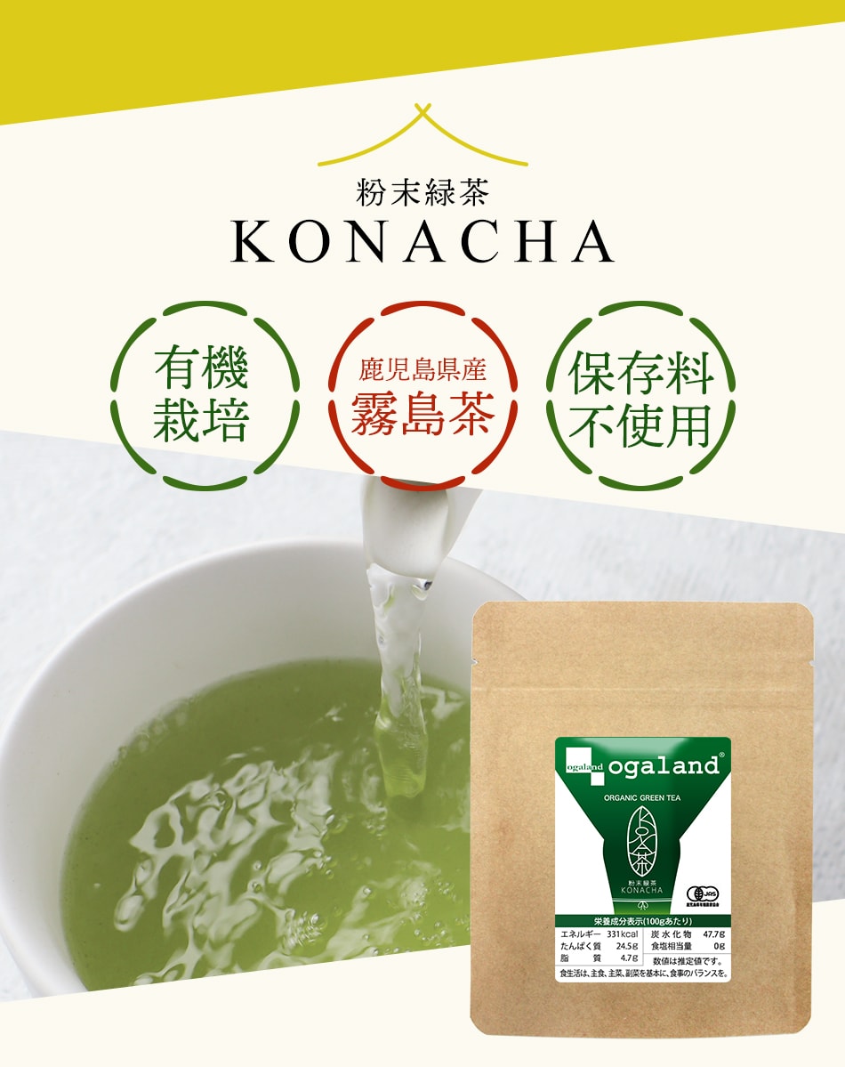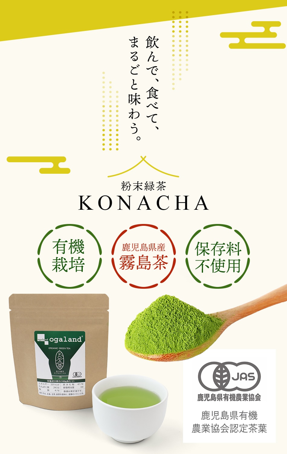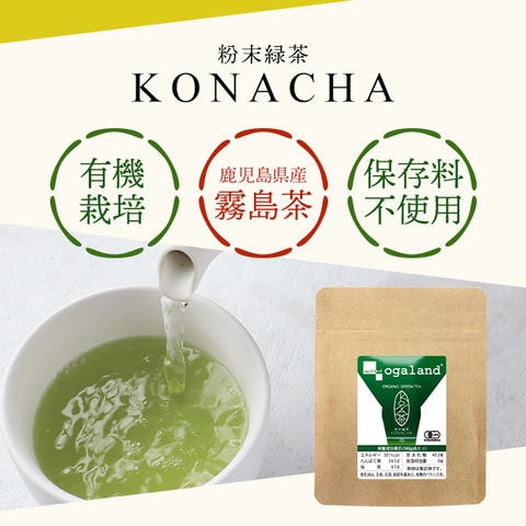 有機JAS KONACHA(50g ×2個セット) 緑茶 茶葉 粉末 送料無料 有機JAS協会認定 鹿児島県産 オーガニック お茶 抹茶 サポニン カテキン 粉末茶 有機緑茶 オーガランド