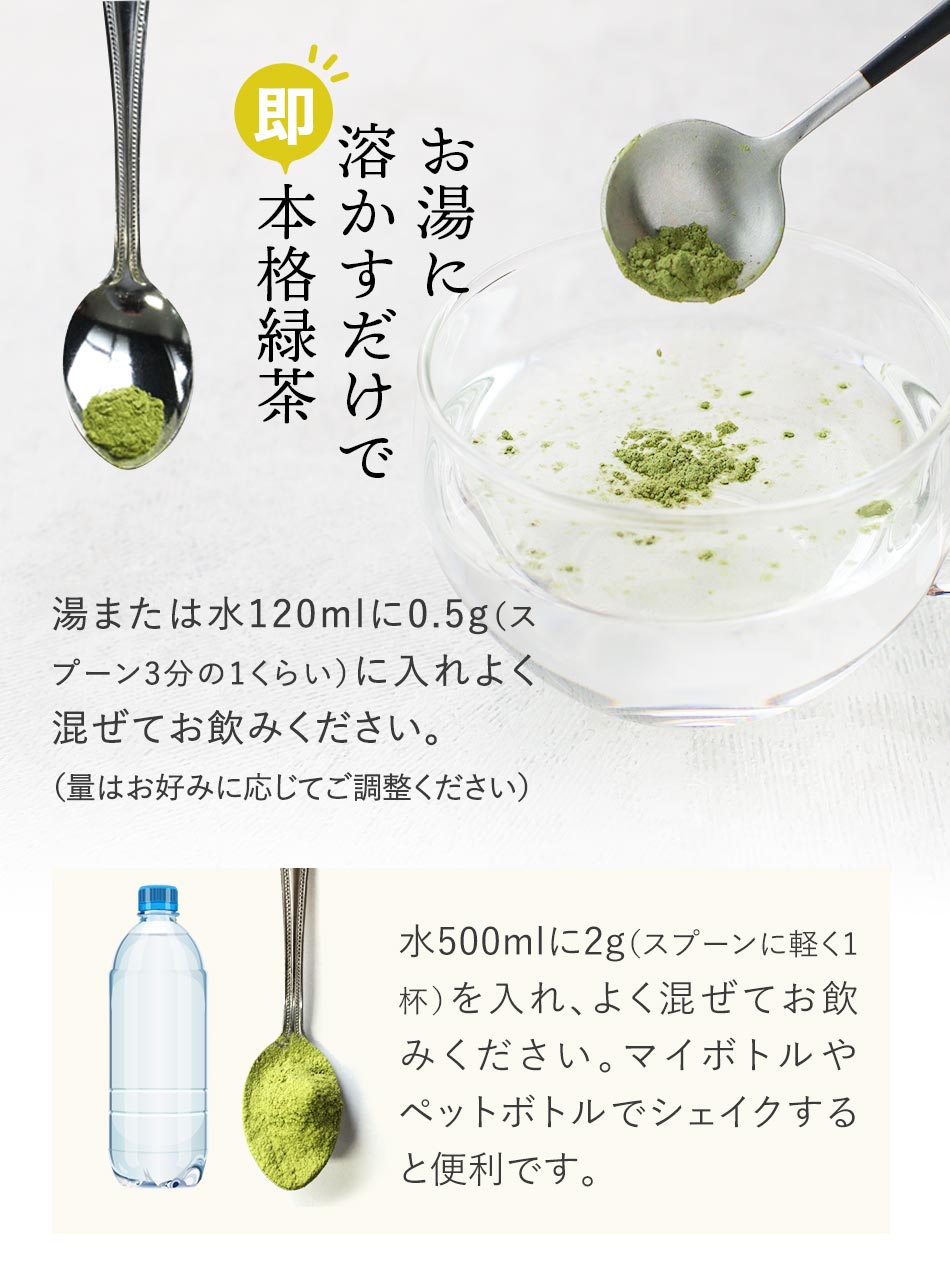 ●湯のみやマグカップの場合:お湯200ccにスプーン1/3杯(約1g)の茶葉を入れ、よくかき混ぜてお飲みください。