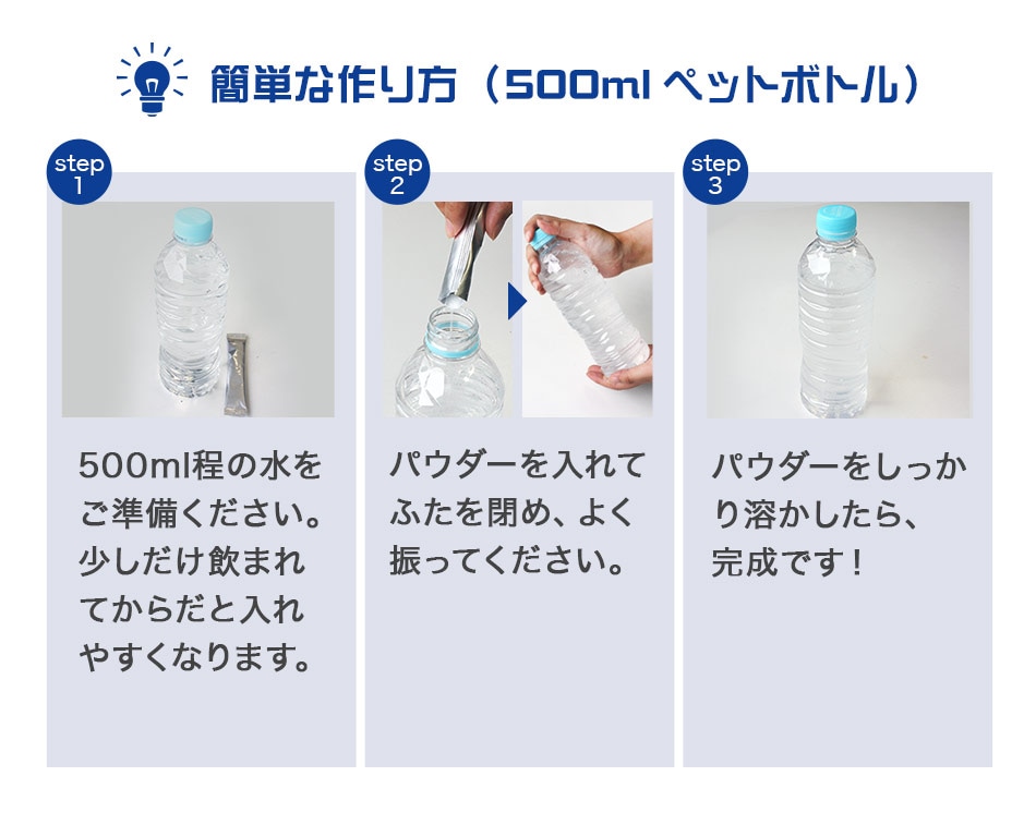 1包を500cc程度の水に良く溶かして、1日に1~2包を目安に、数回に分けてお召し上がりください。