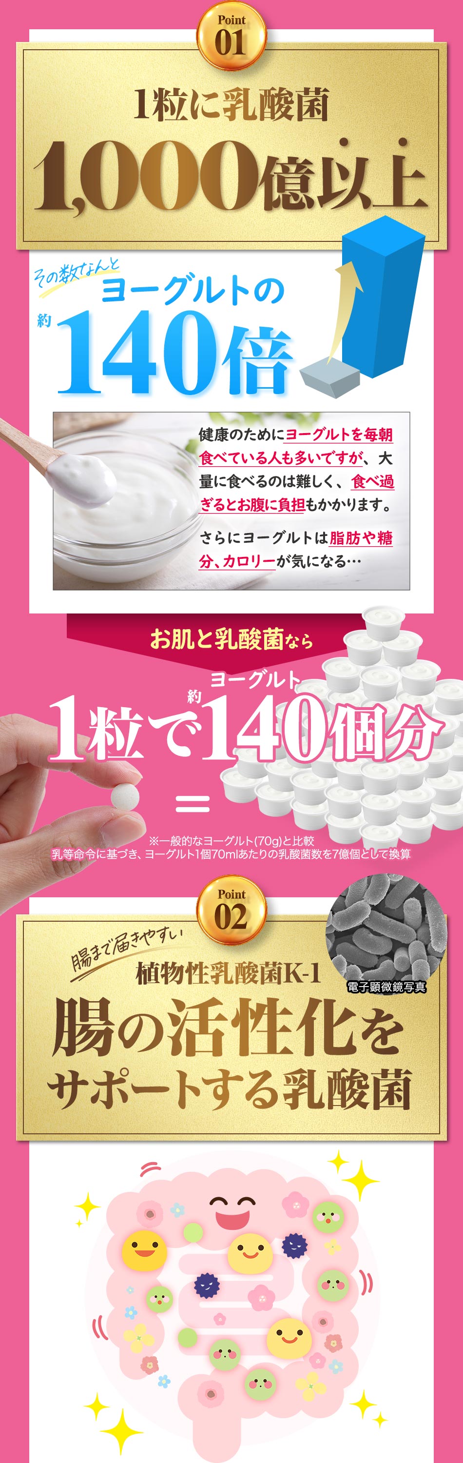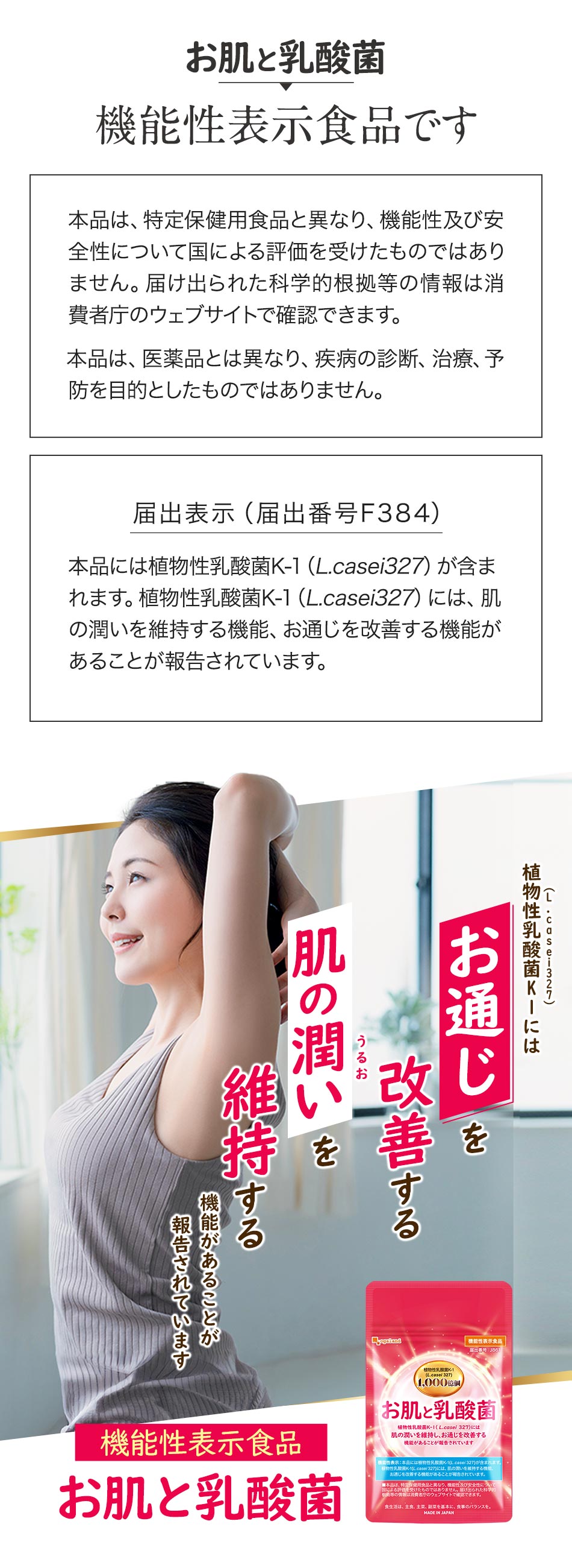 本品には植物性乳酸菌K-1(L.casei327)が含まれます。植物性乳酸菌K-1(L.casei327)には、肌の潤いを維持する機能、お通じを改善する機能があることが報告されています。