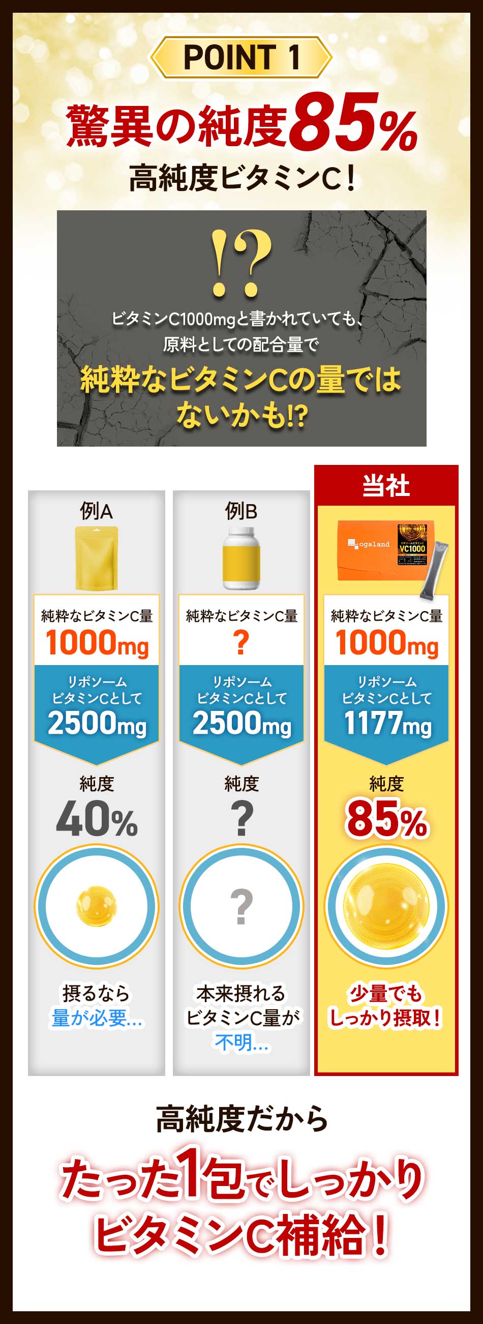 主要原料(1粒あたり):リポソーム型ビタミンC 1177mg(ビタミンCとして 1000.45mg)