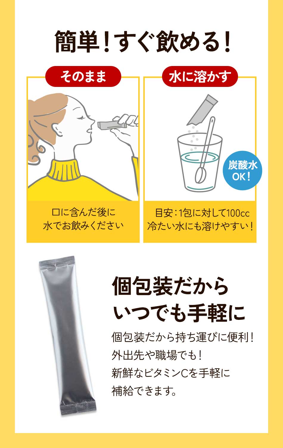 また、粉末をそのまま口に入れて水と一緒にお召し上がり頂くこともできます。