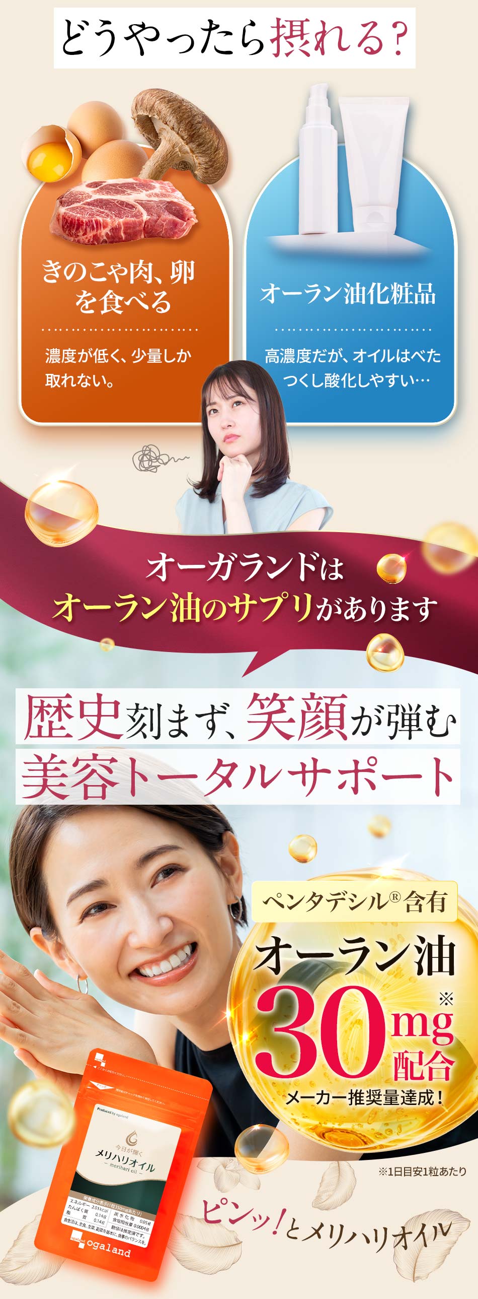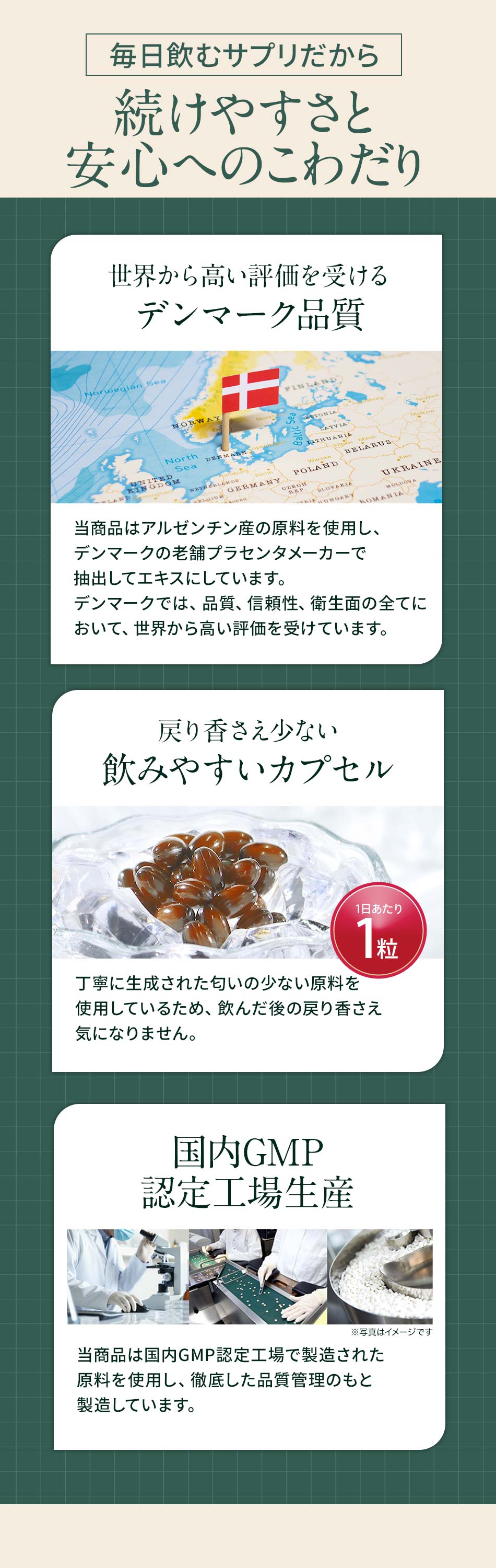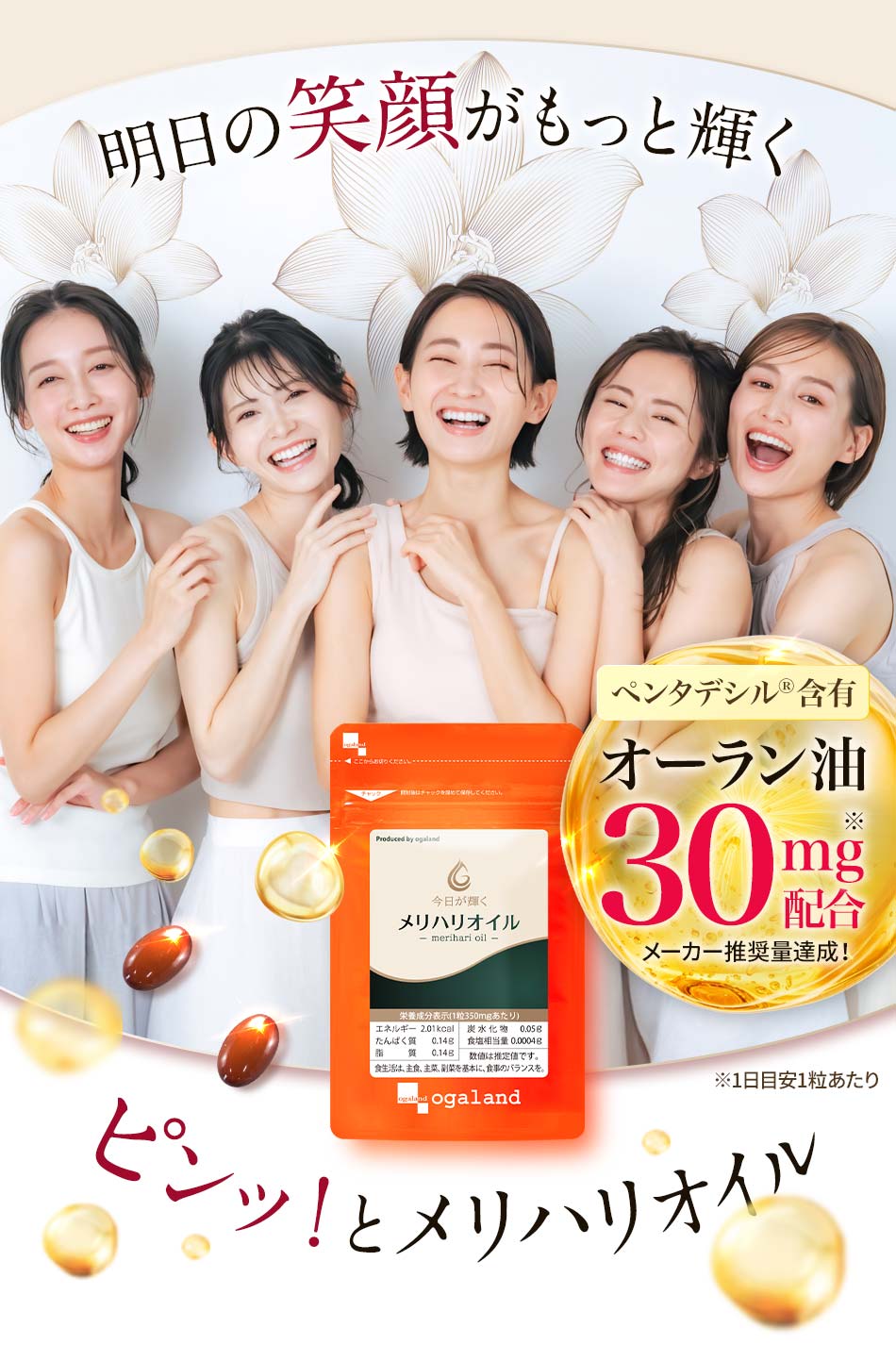 主要原料(1粒あたり):オーランチオキトリウム精製オイル 30mg / コラーゲンペプチド 50mg /豚プラセンタエキス末 5mg