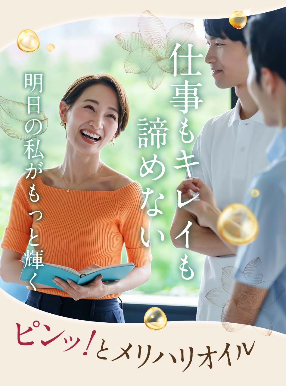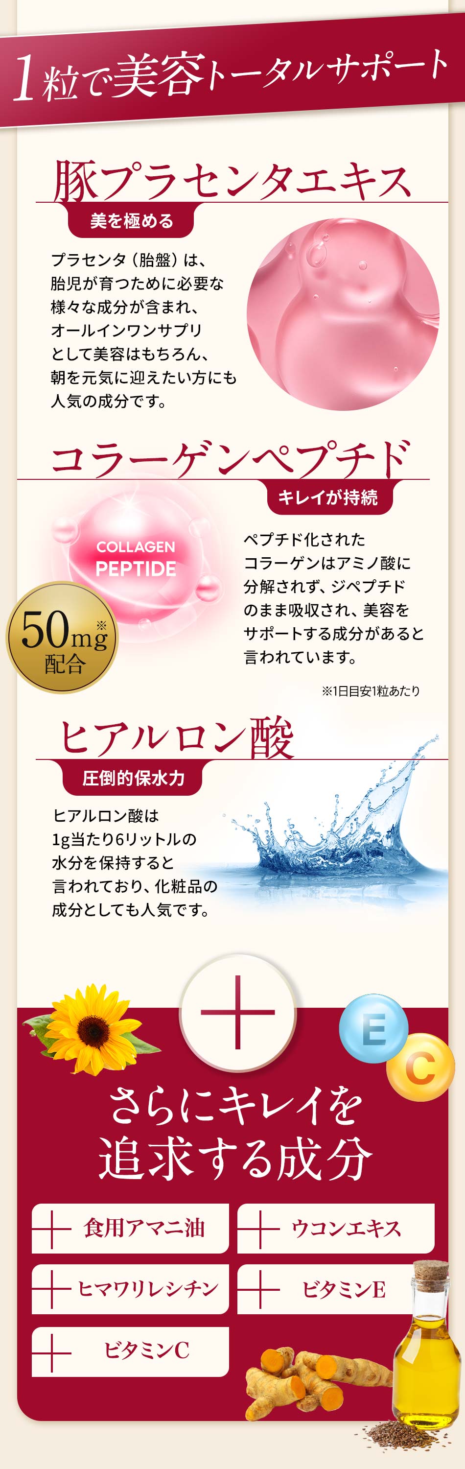 食用アマニ油(国内製造)、コラーゲンペプチド、オーランチオキトリウム精製オイル、豚プラセンタエキス末、ウコンエキス/ゼラチン、グリセリン、ミツロウ、グリセリン脂肪酸エステル、ヒアルロン酸、カラメル色素、ビタミンE、加工デンプン、ビタミンC、ヒマワリレシチン、酸化防止剤(V.E、V.C)、(一部に豚肉・ゼラチンを含む)