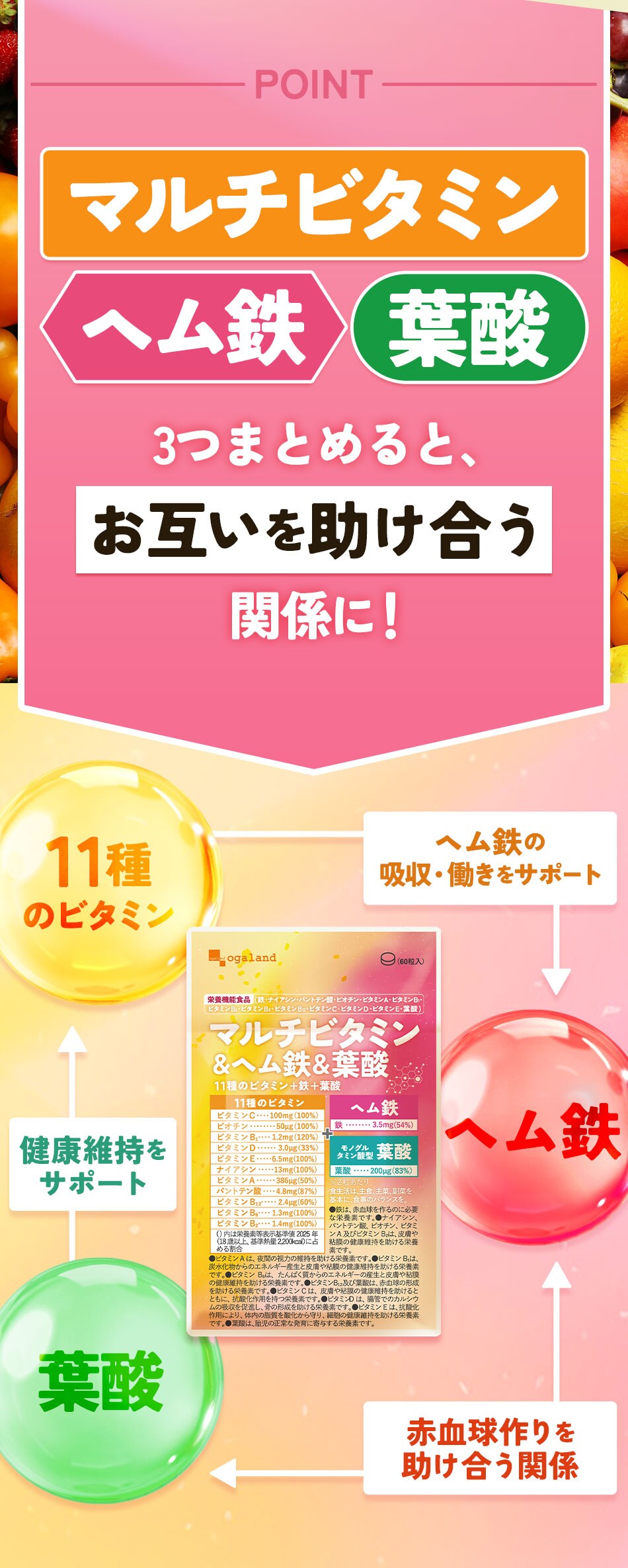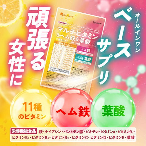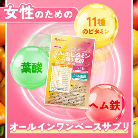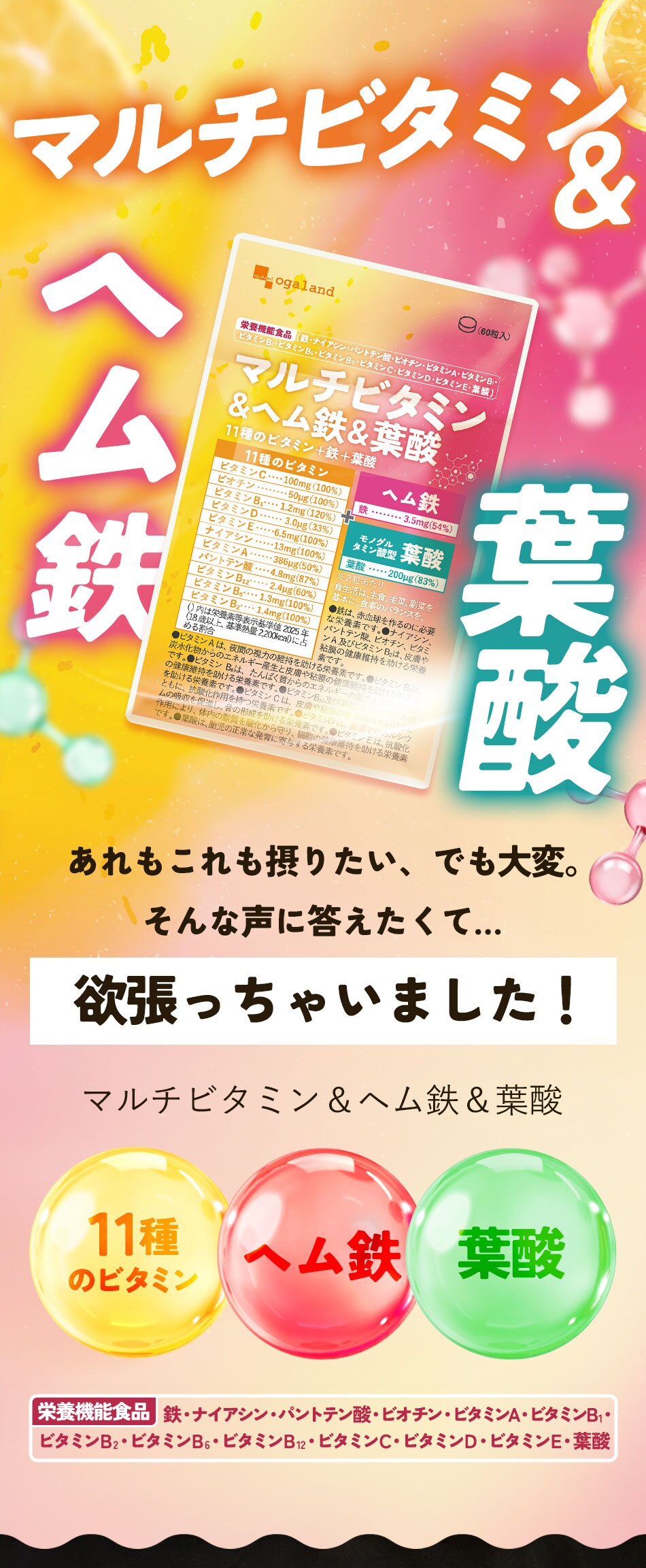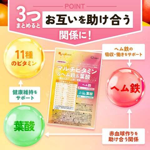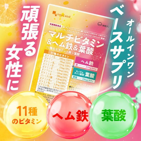 【新発売】マルチビタミン & ヘム鉄 & 葉酸(6個セット・約6ヶ月分) 送料無料 オールインワン 葉酸 鉄 ビタミン サプリ サプリメント 栄養機能食品 ビタミンC ビオチン ビタミンB1 ビタミンE パントテン酸 モノグルタミン酸型 女性 必要栄養素 オーガランド