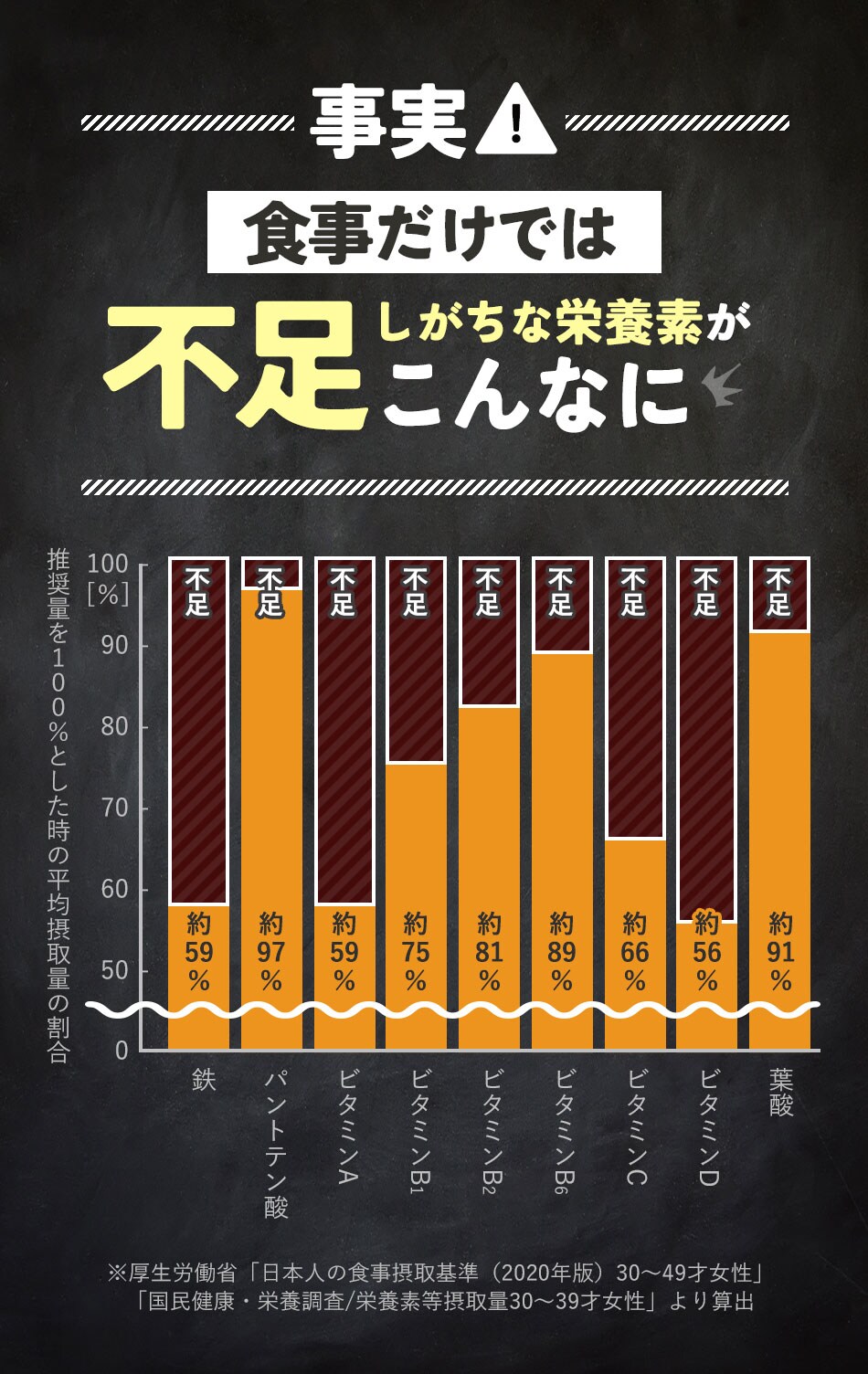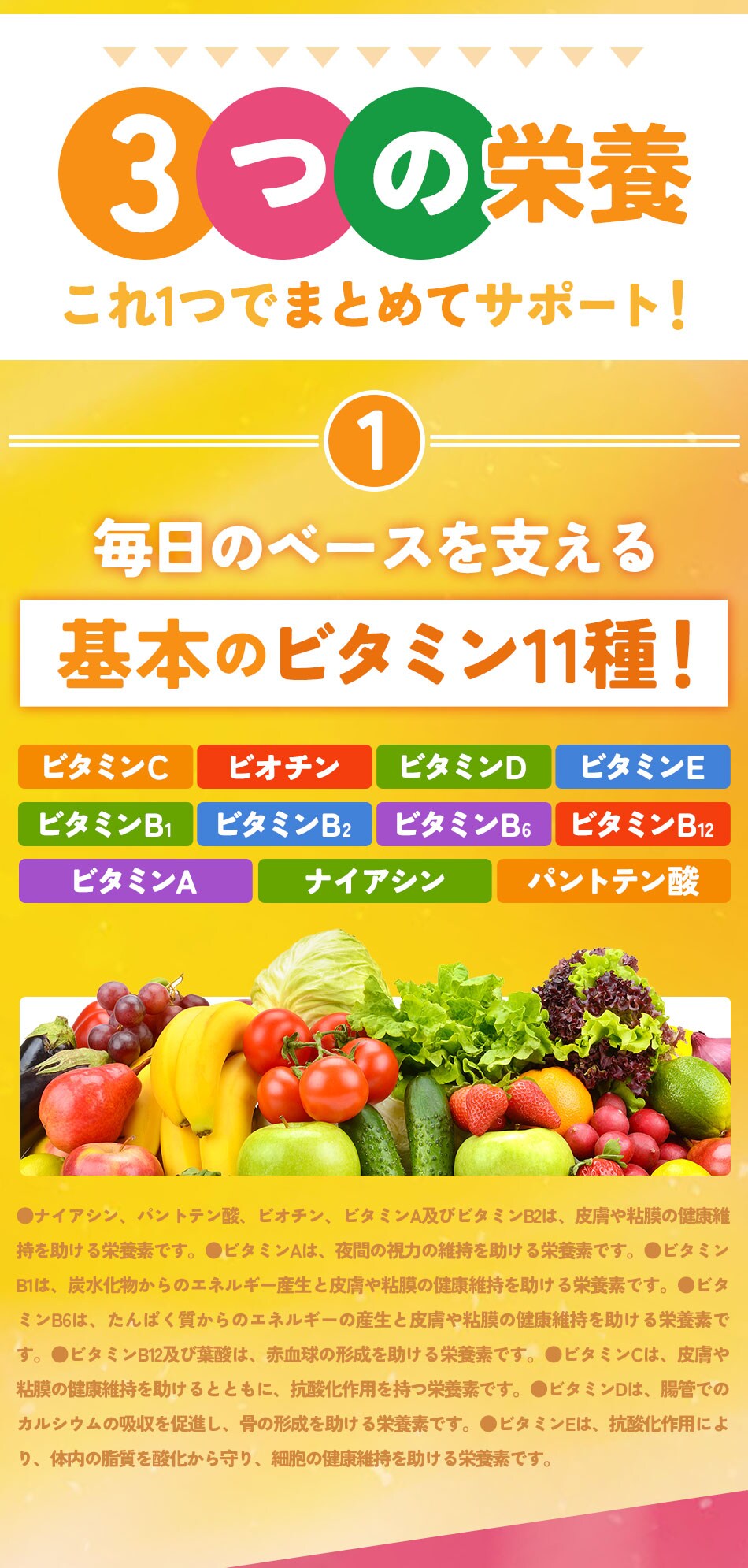 鉄は、赤血球を作るのに必要な栄養素です。 ナイアシン、パントテン酸、ビオチン、ビタミンA及びビタミンB2は、皮膚や粘膜の健康維持を助ける栄養素です。 ビタミンAは、夜間の視力の維持を助ける栄養素です。 ビタミンB1は、炭水化物からのエネルギー産生と皮膚や粘膜の健康維持を助ける栄養素です。 ビタミンB6は、たんぱく質からのエネルギーの産生と皮膚や粘膜の健康維持を助ける栄養素です。 ビタミンB12及び葉酸は、赤血球の形成を助ける栄養素です。 ビタミンCは、皮膚や粘膜の健康維持を助けるとともに、抗酸化作用を持つ栄養素です。 ビタミンDは、腸管でのカルシウムの吸収を促進し、骨の形成を助ける栄養素です。 ビタミンEは、抗酸化作用により、体内の脂質を酸化から守り、細胞の健康維持を助ける栄養素です。 葉酸は、胎児の正常な発育に寄与する栄養素です。