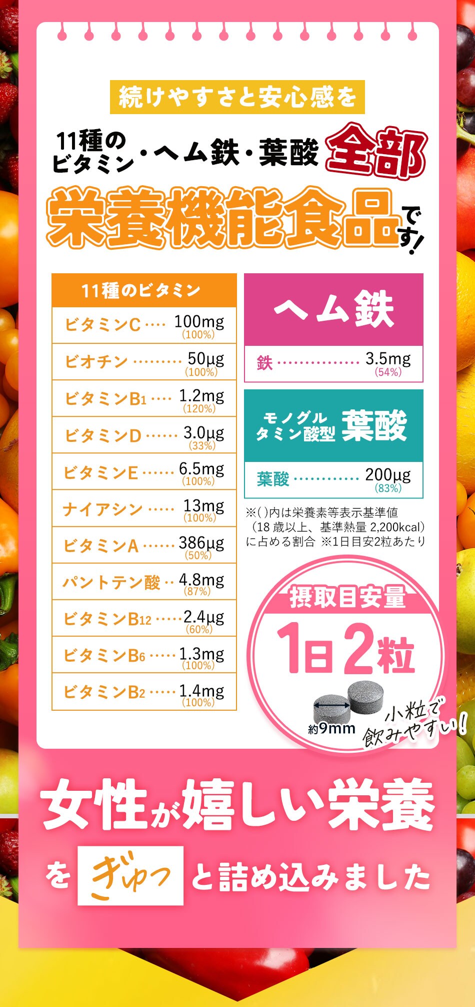 還元麦芽糖水飴(国内製造)、ビタミンE含有植物油 / ヘム鉄、結晶セルロース、ビタミンC、HPC、ナイアシン、ステアリン酸カルシウム、微粒二酸化ケイ素、パントテン酸カルシウム、ビタミンB6、ビタミンB2、ビタミンB1、ビタミンA、葉酸、ビオチン、ビタミンB12、ビタミンD