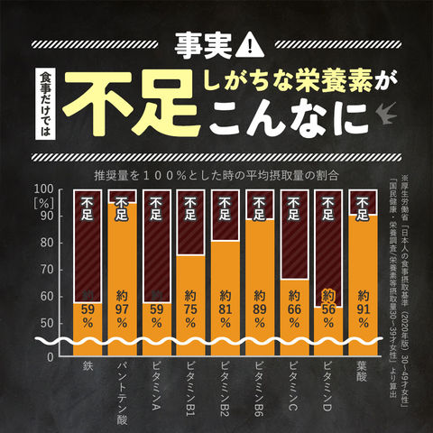 ビタミンB6:100% ビタミンB12:60% ビタミンC:100% ビタミンD:33% ビタミンE:100% 葉酸:83%