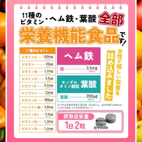 主要原料(1粒あたり):鉄 1.75 mg / ナイアシン 6.5mg / パントテン酸 2.4mg / ビオチン 25μg / ビタミンA 193μg / ビタミンB1 0.6mg / ビタミンンB2 0.7mg / ビタミンB6 0.65mg / ビタミンB12 1.2μg / ビタミンC 50mg / ビタミンD 1.5μg / ビタミンE 3.25mg / 葉酸 100μg