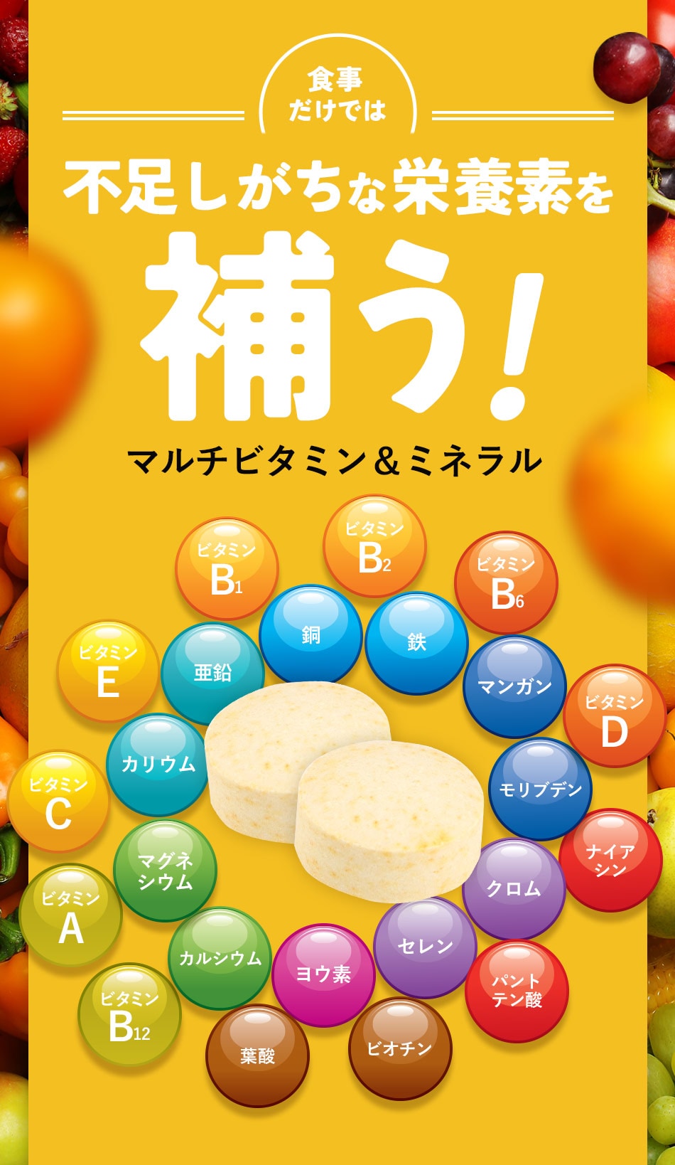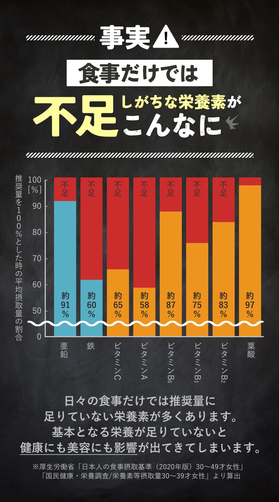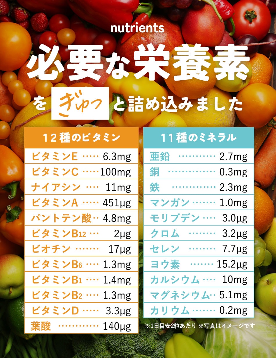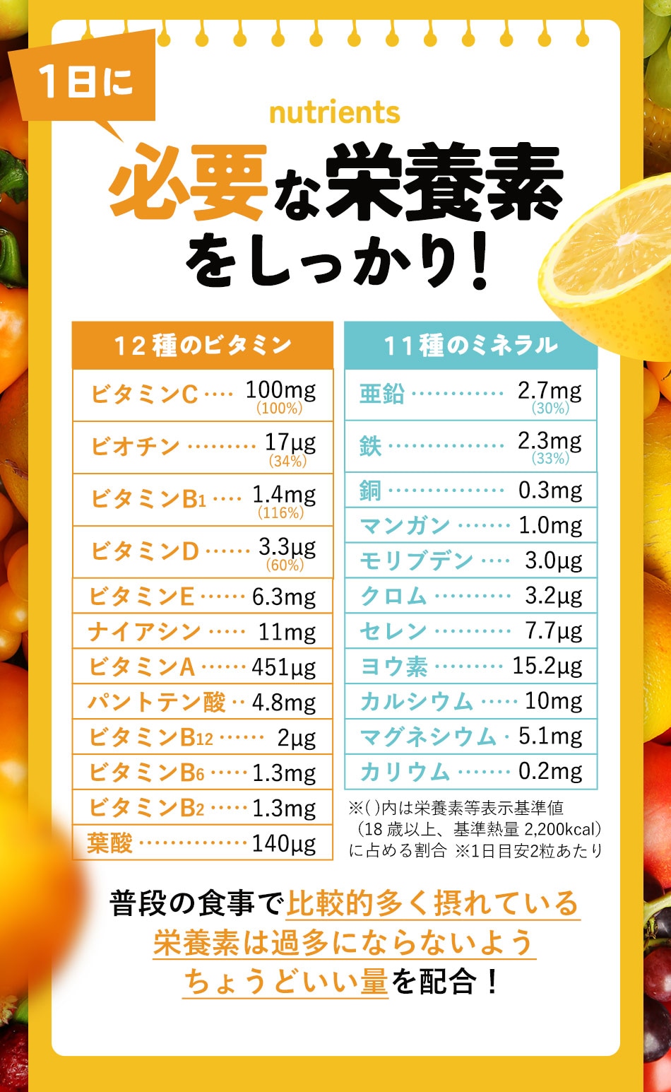 (対象年齢18 歳以上、基準熱量2,200kcal)に占める割合: 亜鉛 30%、鉄 33%、V.C 100%、、ビオチン 34%、V.B1 116%、V.D 60%