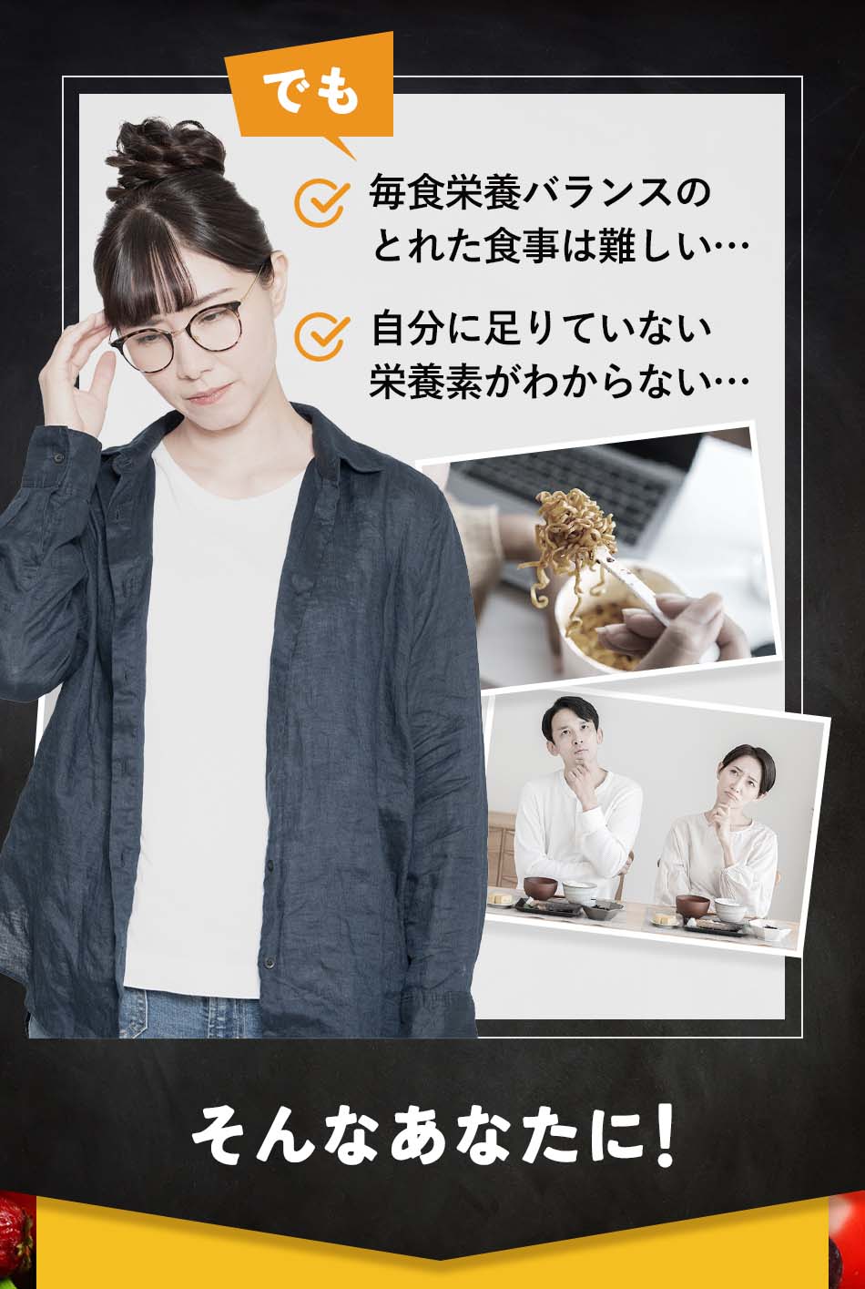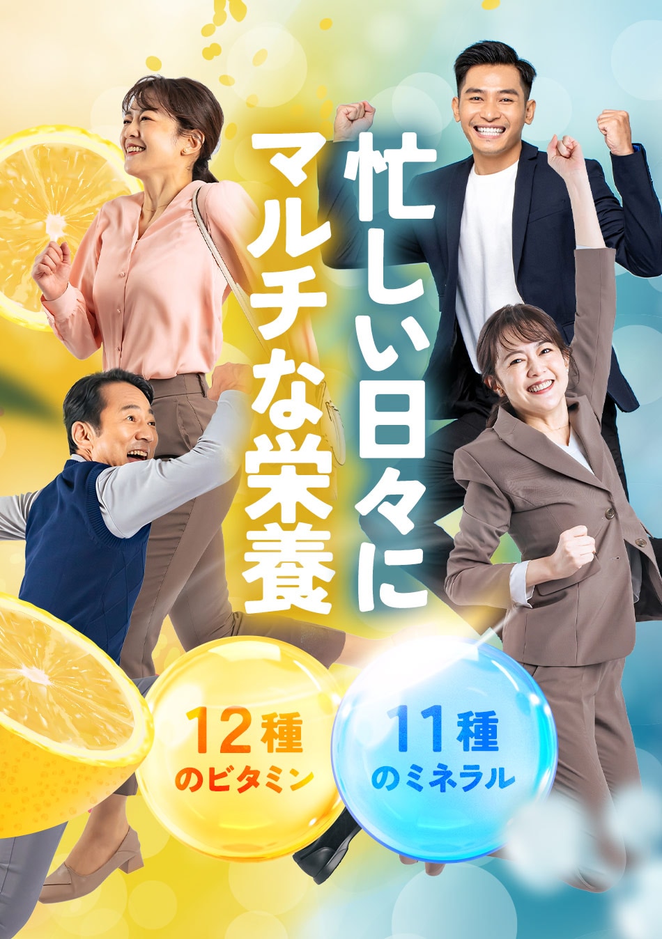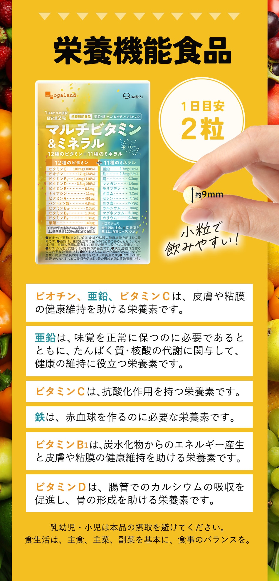 (対象年齢18 歳以上、基準熱量2,200kcal)に占める割合: 亜鉛 30%、鉄 33%、V.C 100%、、ビオチン 34%、V.B1 116%、V.D 60%