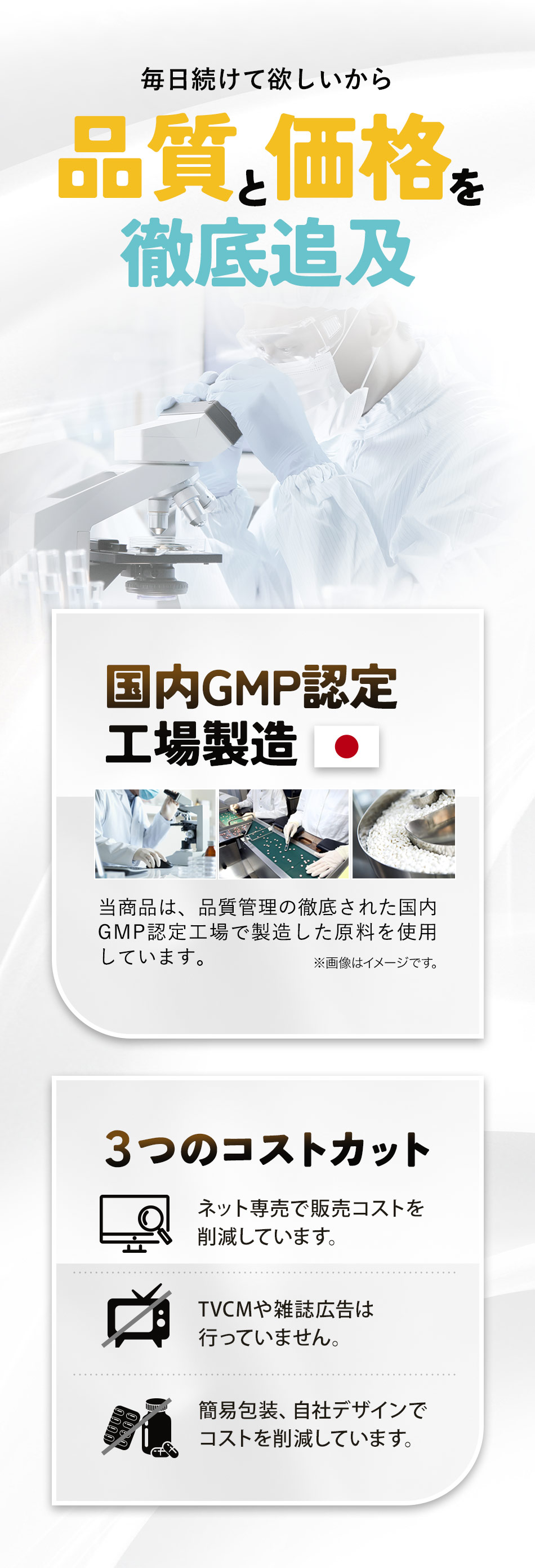 主要原料(1粒あたり):亜鉛 1.35mg/銅 0.15mg/鉄 1.15mg/ビタミンE 3.15mg/ビタミンC 50mg/ナイアシン 5.5mg/ビタミンA 225.5μg/パントテン酸 2.4mg/ビタミンB12 1.0μg/ビオチン 8.5μg/ビタミンB6 0.65mg/ビタミンB1 0.7mg/ビタミンB2 0.65mg/ビタミンD 1.65μg/葉酸 70μg