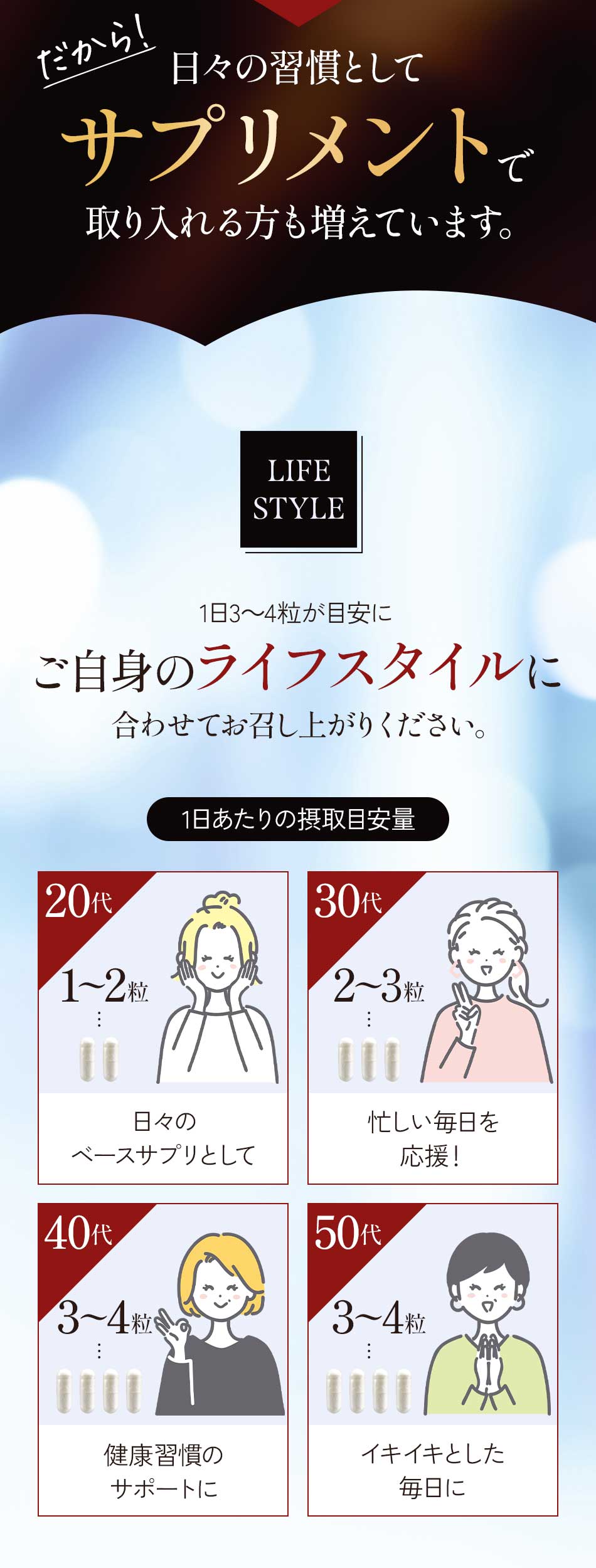 1日に3~4粒を目安に、水またはぬるま湯などでお召し上がりください。