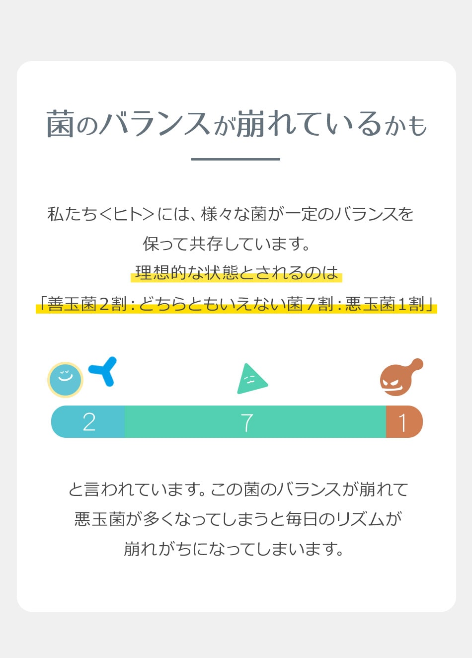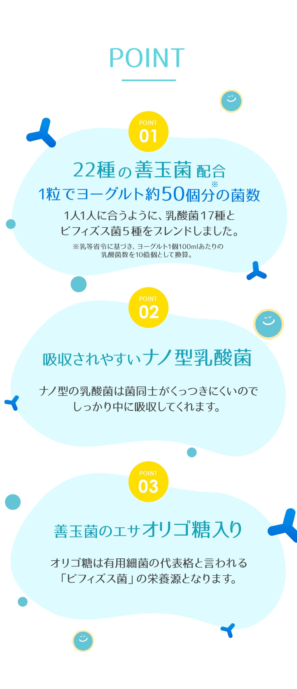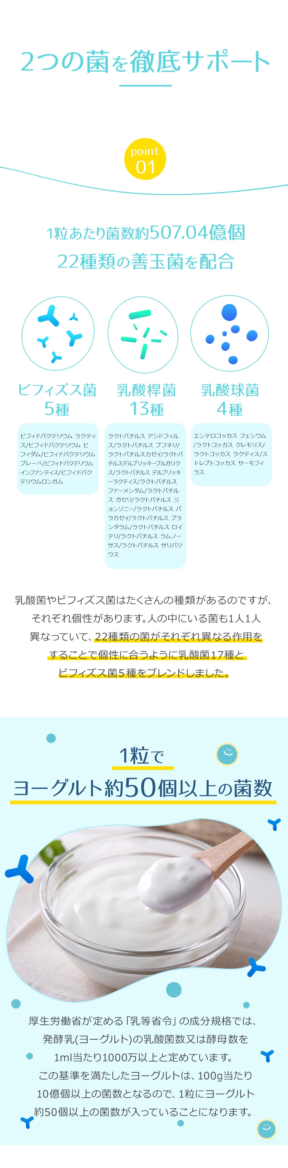 主要原料(1粒あたり):フラクトオリゴ糖 40mg / 殺菌乳酸菌 10.54mg