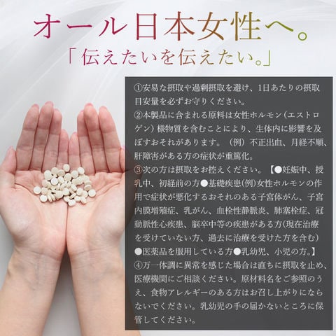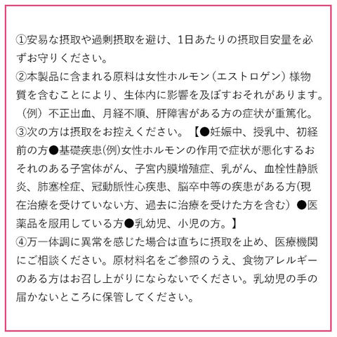 本製品に含まれる原料は女性ホルモン(エストロゲン)様物質を含むことにより、生体内に影響を及ぼすおそれがあります。(例)不正出血、月経不順、肝障害がある方の症状が重篤化。