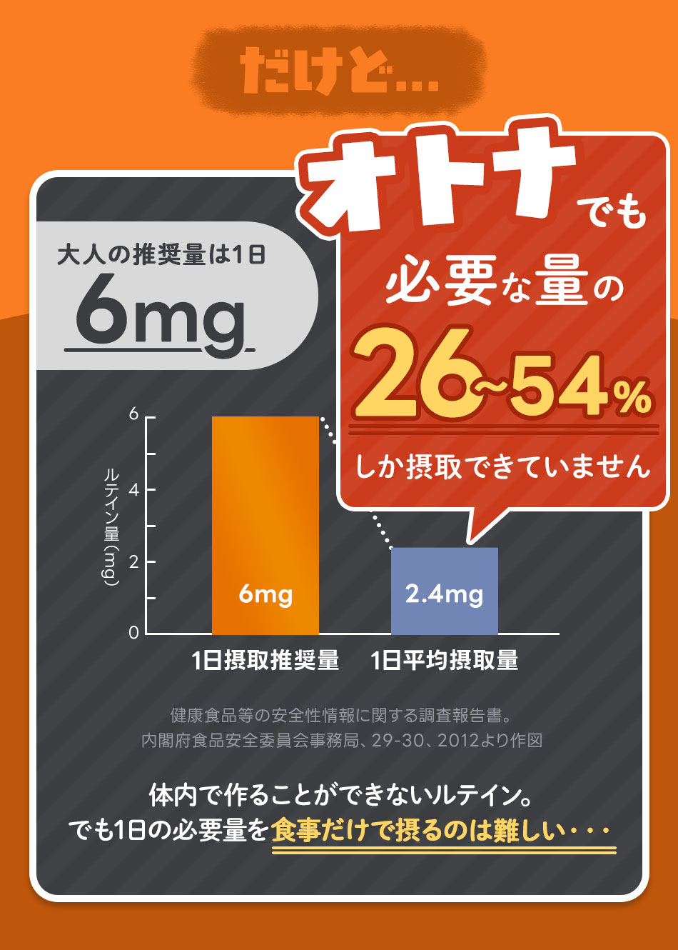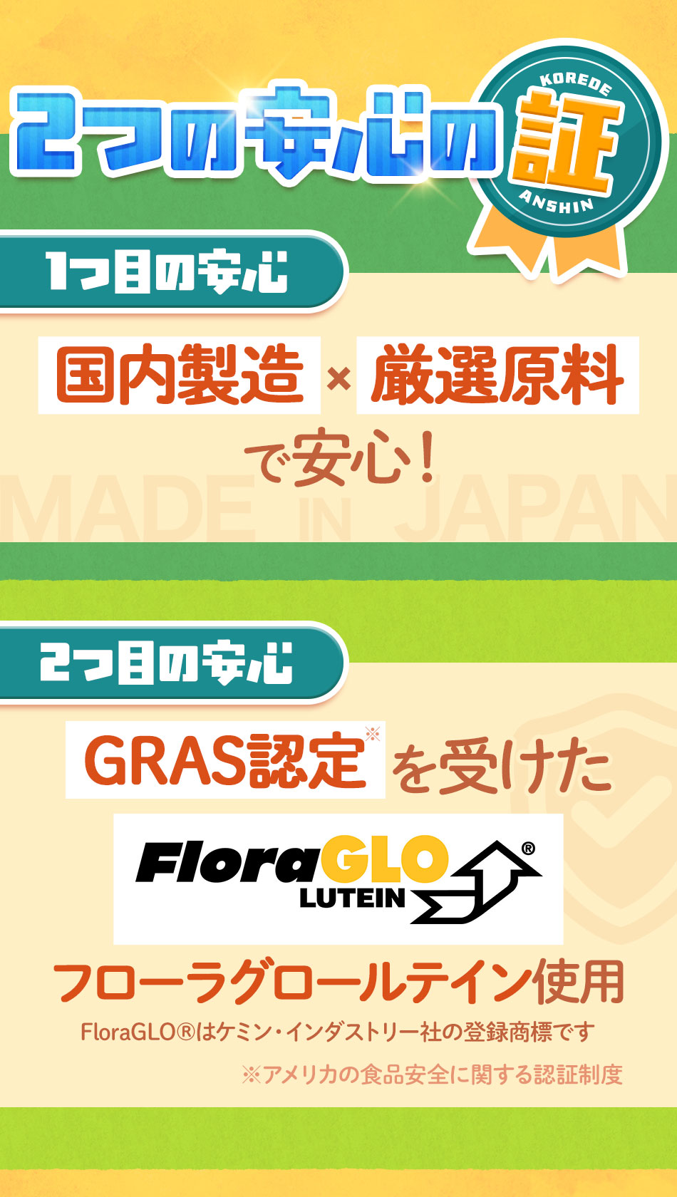 還元麦芽糖水あめ(国内製造)、エリスリトール、ブルーベリー果汁末(デキストリン、ブルーベリー果汁)、さとうきび抽出物、みりん粕パウダー、海洋深層水加工品、乳酸菌末(殺菌)(乳成分を含む)、メグスリノキ抽出物、ホスファチジルセリン含有リン脂質末(大豆を含む)、海藻由来DHA粉末、ビルベリーエキス末、乾燥野菜粉末/ソルビトール、HPC、セルロース、ステアリン酸カルシウム、酸味料、微粒酸化ケイ素、クチナシ色素、甘味料(ステビア)、香料、マリーゴールド色素