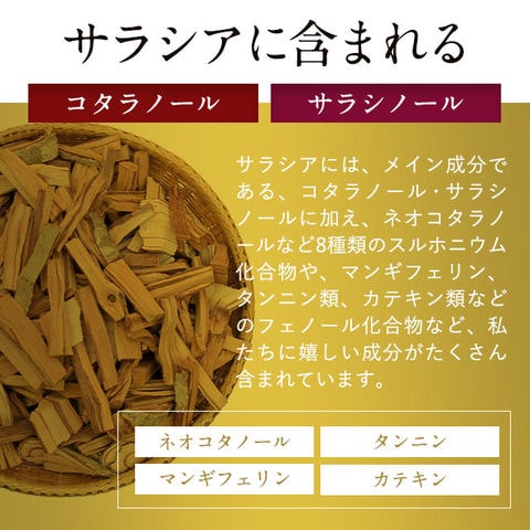 還元麦芽糖水飴(国内製造)、サラシアエキス末(サラシアエキス、デキストリン) / 結晶セルロース、ステアリン酸カルシウム、微粒二酸化ケイ素