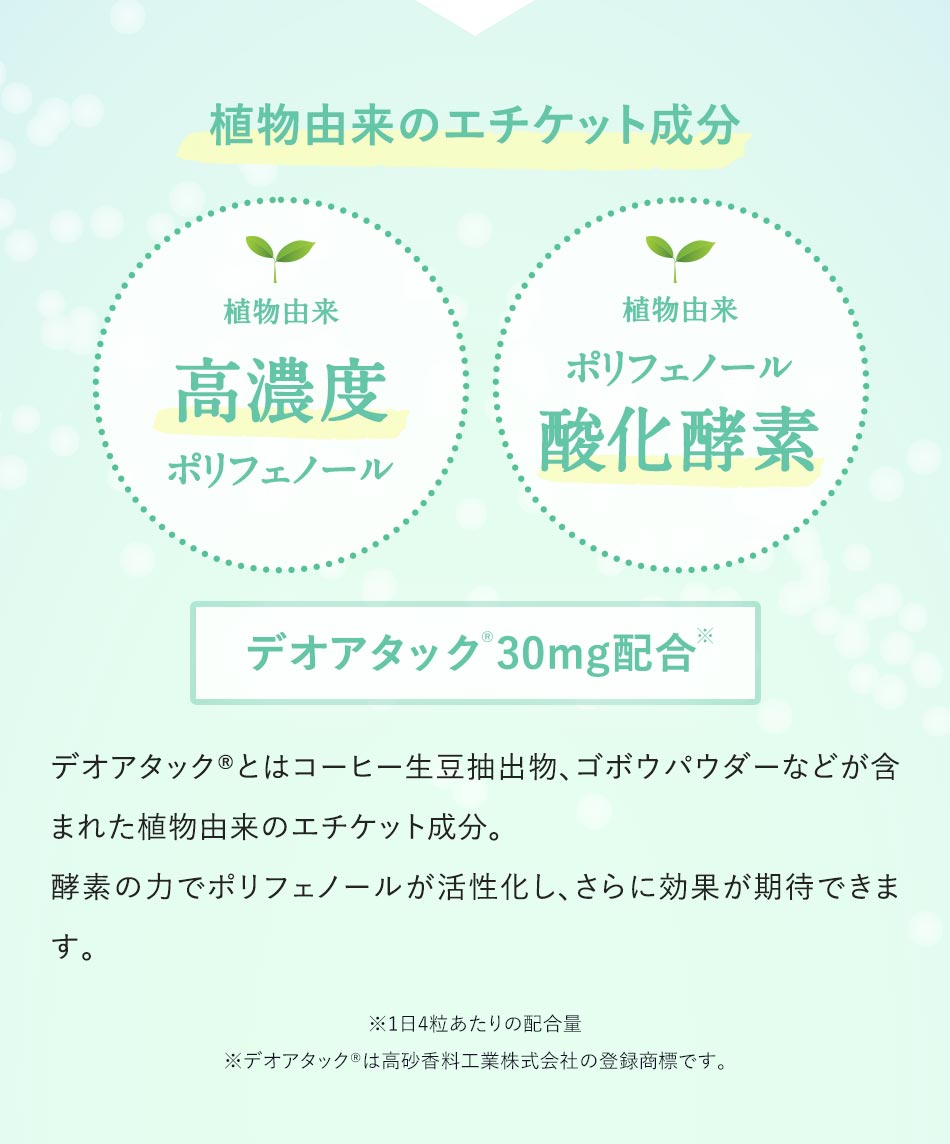 (1粒あたり):シャンピニオンエキス 50mg / デオアタック®(コーヒー生豆抽出物、ゴボウパウダー) 7.5mg