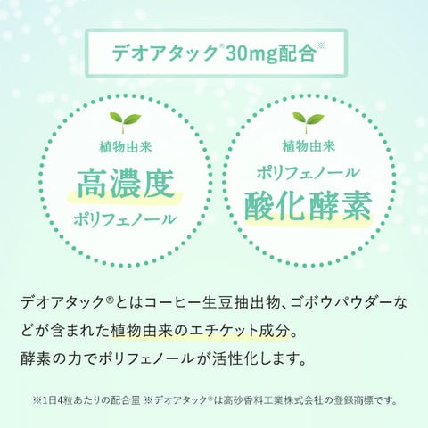 主要原料(1粒あたり):シャンピニオンエキス 50mg / デオアタックR(コーヒー生豆抽出物、ゴボウパウダー) 7.5mg /