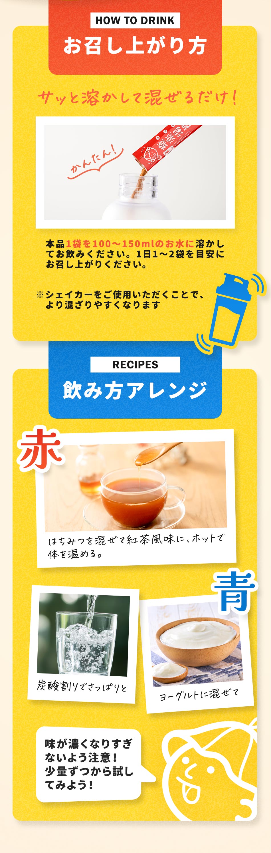 1日に1~2包を目安に、100~150cc程度の水やぬるま湯によく溶かしてお召し上がりください。