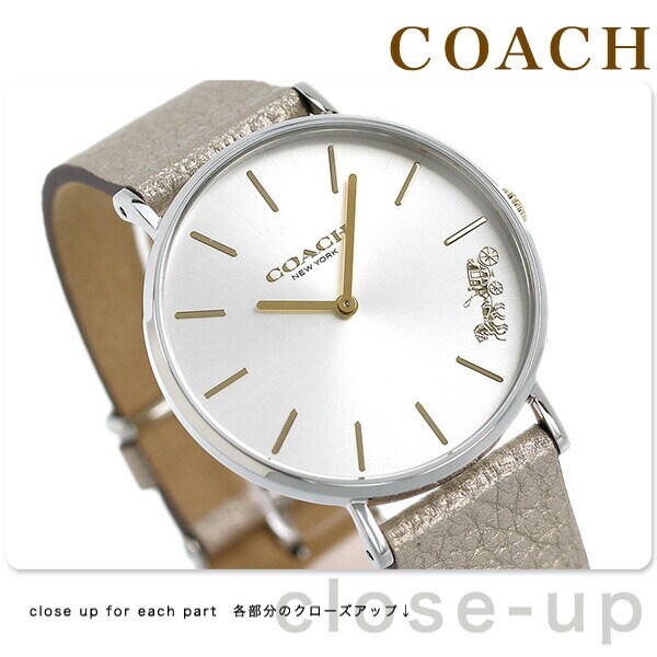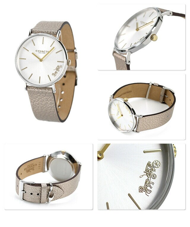 3年保証キャンペーン コーチ ペリー 36mm クオーツ レディース 腕時計 14503157 COACH PERRY アナログ シルバー×メタリックグレージュ 革ベルト ◆コーチは1941年にマンハッタンの小さなロフトで皮革製品の家内工業として始まりました。今日では世界中で絶大な人気を誇るファッションブランドです。男女問わず多岐にわたるシックで機能的なアクセサリーにきめ細かな最高品質の素材を用いて、現代的なアメリカンスタイルを取り入れた身近な高級品という新しい定義を形成しています。コーチブランドの柄、色、詳細な金具を取り入れたコーチウォッチは、最新のコーチバッグやデザインコレクションと新鮮でファッショナブルにマッチすると共に、精密なクオーツを備えてます。 ニューヨークシティのウェストヴィレッジの静かな通りの名前にちなんだペリー。伝統的なラウンド型のウォッチで、日常使いにぴったりです。4時位置のブランドロゴとシグネチャー柄の遊革がポイント。シーンを選ばないデザインは、自分へのご褒美にはもちろん、プレゼントにもオススメです。
