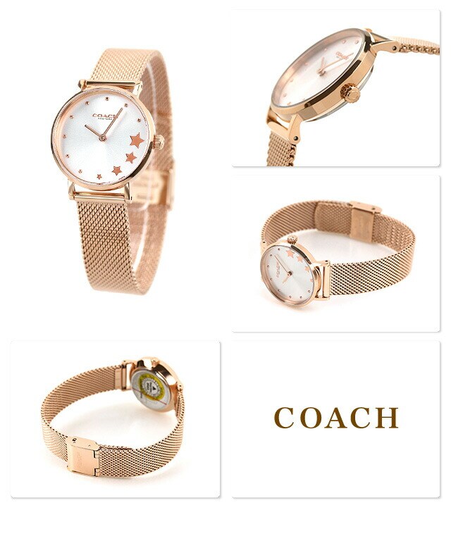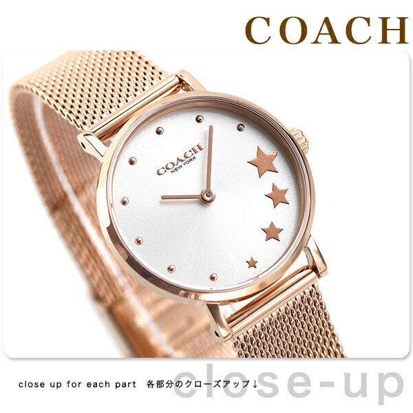 3年保証キャンペーン コーチ ペリー 28mm クオーツ レディース 腕時計 14503520 COACH PERRY アナログ シルバー×ピンクゴールド ◆コーチは1941年にマンハッタンの小さなロフトで皮革製品の家内工業として始まりました。今日では世界中で絶大な人気を誇るファッションブランドです。男女問わず多岐にわたるシックで機能的なアクセサリーにきめ細かな最高品質の素材を用いて、現代的なアメリカンスタイルを取り入れた身近な高級品という新しい定義を形成しています。コーチブランドの柄、色、詳細な金具を取り入れたコーチウォッチは、最新のコーチバッグやデザインコレクションと新鮮でファッショナブルにマッチすると共に、精密なクオーツを備えてます。 ニューヨークシティのウェストヴィレッジの静かな通りの名前にちなんだペリー。伝統的なラウンド型のウォッチで、日常使いにぴったりです。文字盤に並ぶ星がポイント。プレゼントにもオススメです。