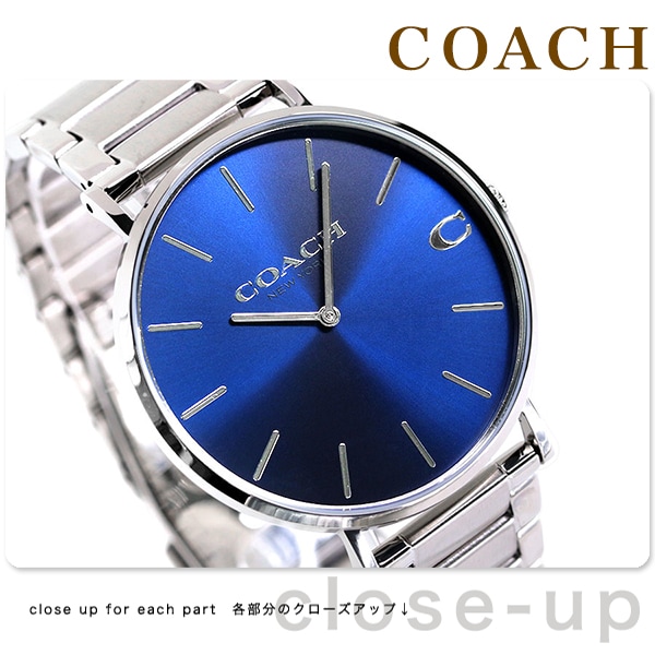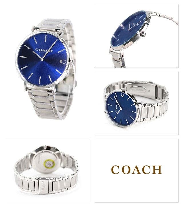 3年保証キャンペーン コーチ チャールズ 41mm クオーツ メンズ 腕時計 14602429 COACH CHARLES アナログ ブルー ◆コーチは1941年にマンハッタンの小さなロフトで皮革製品の家内工業として始まりました。今日では世界中で絶大な人気を誇るファッションブランドです。男女問わず多岐にわたるシックで機能的なアクセサリーにきめ細かな最高品質の素材を用いて、現代的なアメリカンスタイルを取り入れた身近な高級品という新しい定義を形成しています。コーチブランドの柄、色、詳細な金具を取り入れたコーチウォッチは、最新のコーチバッグやデザインコレクションと新鮮でファッショナブルにマッチすると共に、精密なクオーツを備えてます。 大きめのケースサイズと見やすいインデックスが特徴。3時位置にはブランド名の頭文字でもある「C」をデザインしています。カジュアルスタイルから、スーツなどのジャケットスタイルにまでシーンを問わずお使いいただけます。