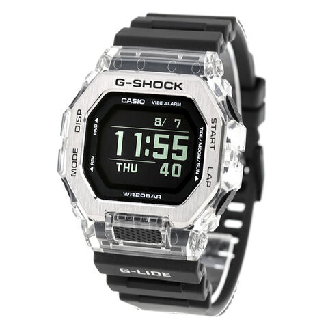 7年保証キャンペーン gショック ジーショック G-SHOCK Gライド GBX-100シリーズ クォーツ 電池式 Bluetooth クォーツ 電池式 メンズ 腕時計 GBX-100S-1DR G-LIDE GBX-100 Series デジタル ブラック ◆G-SHOCKのスポーツラインG-LIDEから、サマーシーズンに映えるマテリアルとカラーを纏ったモデルの登場です。陽射しを受けて煌めく波のイメージを2つの素材を組み合わせたベゼルで表現。トップにステンレススチールパーツを使用し、斜面をミラー仕上げに。ベース部にはクリアカラーのスケルトン樹脂を採用しました。バンドの主な樹脂パーツには環境負荷低減への貢献が期待される素材を使用しています。スマートフォンリンクを搭載し、専用のアプリケーションを介して潮汐情報や日の出・日の入時刻を世界約3300カ所から選択できます。また、ワイドフェイスで高精細な液晶を採用。タイドグラフ、ムーンデータなどが表示可能です。 国内モデル品番:GBX-100S-1JF