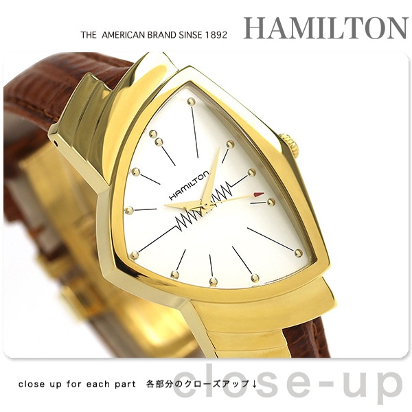 3年保証キャンペーン ハミルトン ベンチュラ クオーツ ベンチュラ60周年記念 復刻モデル 32.5MM スイス製 クオーツ ペアウォッチ メンズ 腕時計 H24301511 HAMILTON VENTURA QUARTZ アナログ ゴールド×ライトブラウン 革ベルト ◆HAMILTON(ハミルトン)はアメリカ発祥の老舗ブランドです。創業翌年に誕生した懐中時計「ブロードウェイ・リミテッド」は、他の時計よりも正確に時を刻むことから鉄道用時計として採用されました。その後も航空用時計や軍用時計として採用されるなど、品質の高さと流行にながされない独自のデザインが世界中の人々に支持されています。 時計史上の革命児「ベンチュラ」。常識とかけ離れた左右非対称のフォルムは、保守的なデザインが主流であった時計業界に波紋を投げかけ、デザインウォッチの先駆けとして後世に大きな影響を及ぼしました。1957年のベンチュラ登場から60周年を記念し、イエローゴールドカラーの復刻モデルが登場。個性的かつ上品な雰囲気の腕元を演出します。ペアウォッチとしてのご使用もオススメ。