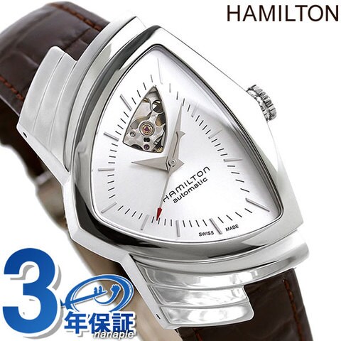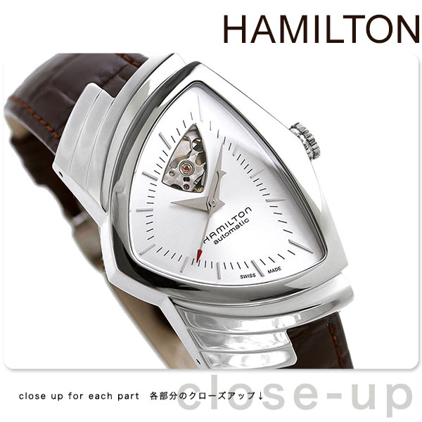 3年保証キャンペーン ハミルトン ベンチュラ オープンハート オート スイス製 自動巻き メンズ 腕時計 H24515552 HAMILTON VENTURA OPENHEART AUTO アナログ シルバー×ブラウン 革ベルト ◆HAMILTON(ハミルトン)はアメリカ発祥の老舗ブランドです。創業翌年に誕生した懐中時計「ブロードウェイ・リミテッド」は、他の時計よりも正確に時を刻むことから鉄道用時計として採用されました。その後も航空用時計や軍用時計として採用されるなど、品質の高さと流行にながされない独自のデザインが世界中の人々に支持されています。 時計史上の革命児「ベンチュラ」。常識とかけ離れた左右非対称のフォルムは、保守的なデザインが主流であった時計業界に波紋を投げかけ、デザインウォッチの先駆けとして後世に大きな影響を及ぼしました。文字盤上部分スケルトンから覗くムーブメントがワンランク上の腕元を演出。カジュアルからスーツスタイルまでシーンを選ばず腕元を飾ります。 機械式腕時計