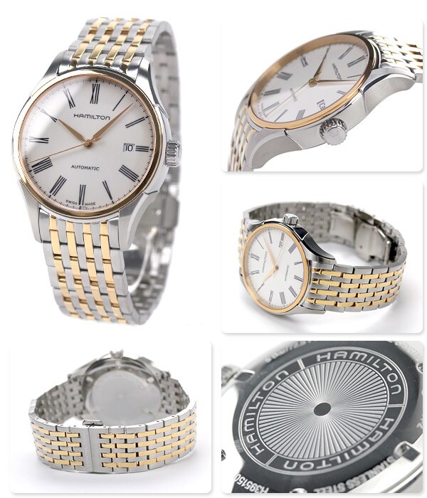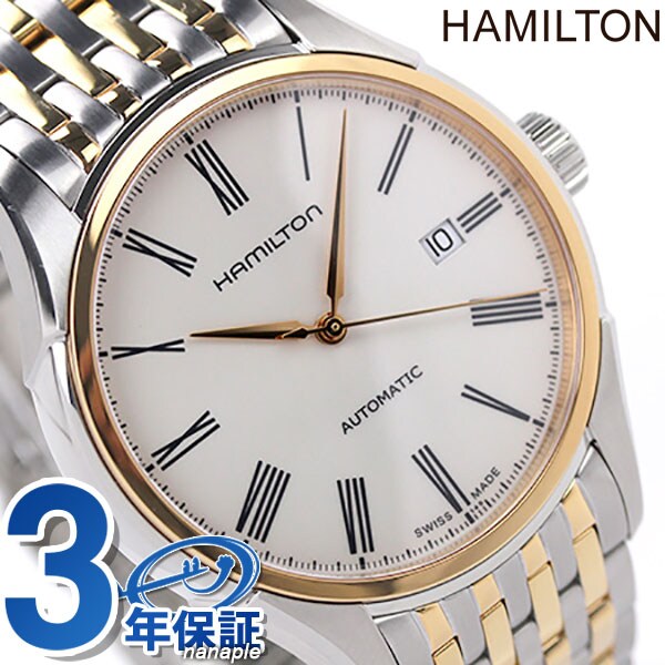 3年保証キャンペーン ハミルトン 腕時計 VALIANT AUTO 自動巻き メンズ デイト シルバー×ゴールド HAMILTON H39525214 HAMILTON(ハミルトン)はアメリカ発祥の老舗ブランドです。創業翌年に誕生した懐中時計「ブロードウェイ・リミテッド」は、他の時計よりも正確に時を刻むことから鉄道用時計として採用されました。その後も航空用時計や軍用時計として採用されるなど、品質の高さと流行にながされない独自のデザインが世界中の人々に支持されています。 スタイリッシュなローマ数字を採用したインデックスが特徴的なモデル。3時位置には日付表示を配置。腕元に洗練された上品さをプラスします。 機械式腕時計
