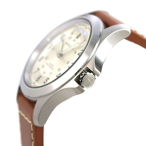 3年保証キャンペーン ハミルトン 腕時計 Khaki Field King 40MM 自動巻き メンズ ゴールド×ブラウンカーフ HAMILTON H64455523 HAMILTON(ハミルトン)は流行にながされない独自のデザインと品質の高さから世界中の人々に愛される老舗ブランドです。 タウンユースにもビジネスユースにもマルチに対応するデザイン。12時位置に日付と曜日が表示されます。存在感あふれるリューズプロテクター付き40mm径ケースを採用し、実用性も抜群です。 機械式腕時計