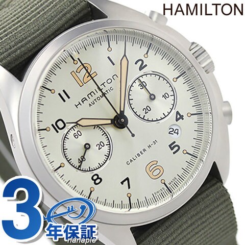 3年保証キャンペーン ハミルトン 腕時計 KHAKI PILOT PIONEER AUTO CHRONO 自動巻き メンズ アイボリー×カーキ テキスタイルベルト HAMILTON H76456955 HAMILTON(ハミルトン)はアメリカ発祥の老舗ブランドです。創業翌年に誕生した懐中時計「ブロードウェイ・リミテッド」は、他の時計よりも正確に時を刻むことから鉄道用時計として採用されました。その後も航空用時計や軍用時計として採用されるなど、品質の高さと流行にながされない独自のデザインが世界中の人々に支持されています。 日付表示とクロノグラフ機能を搭載した実用性のあるモデル。バンドにはテキスタイルを採用しています。 機械式腕時計