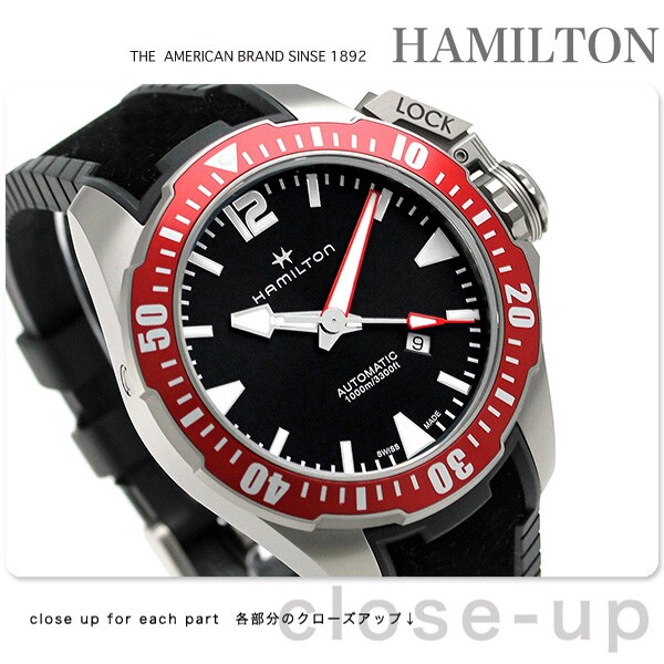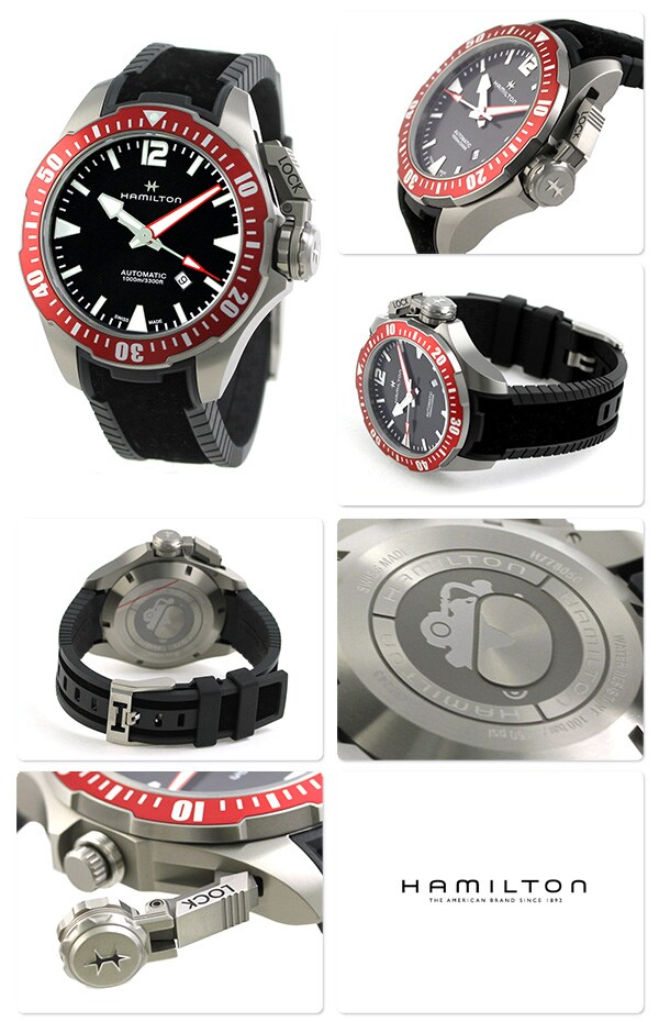 3年保証キャンペーン ハミルトン ダイバーズ カーキ ネイビー オープン ウォーター オート 46mm スイス製 自動巻き メンズ 腕時計 HAMILTON KHAKI NAVY OPEN WATER AUTO 46mm H77805335 アナログ ブラック ◆HAMILTON(ハミルトン)はアメリカ発祥の老舗ブランドです。創業翌年に誕生した懐中時計「ブロードウェイ・リミテッド」は、他の時計よりも正確に時を刻むことから鉄道用時計として採用されました。その後も航空用時計や軍用時計として採用されるなど、品質の高さと流行にながされない独自のデザインが世界中の人々に支持されています。 1951年の名作映画・フロッグメンに登場した潜水時計からインスピレーションを受けてつくられた腕時計。スクリュー式リューズカバーを採用した、本格ダイバーズウォッチです。100気圧防水を搭載、10時位置にはヘリウムガスエスケープバルブ付き。針に施されたレッドカラーがアクセントに。潜水艦イメージのボックスにお入れしてお届けします。 機械式腕時計
