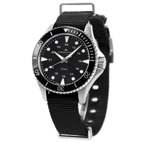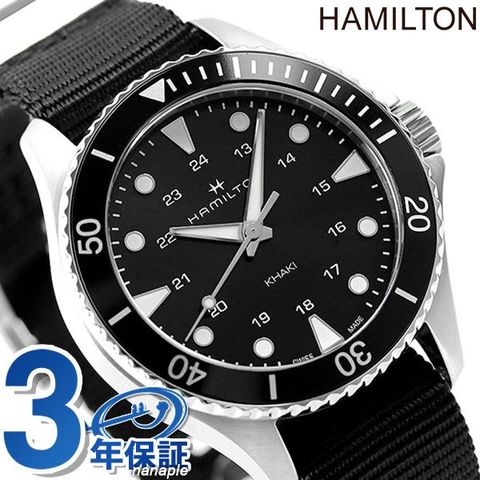 3年保証キャンペーン ハミルトン カーキ ネイビー スキューバ 37mm ダイバーズウォッチ スイス製 クオーツ メンズ 腕時計 H82201931 HAMILTON KHAKI NAVY SCUBA アナログ ブラック ◆HAMILTON(ハミルトン)はアメリカ発祥の老舗ブランドです。創業翌年に誕生した懐中時計「ブロードウェイ・リミテッド」は、他の時計よりも正確に時を刻むことから鉄道用時計として採用されました。その後も航空用時計や軍用時計として採用されるなど、品質の高さと流行にながされない独自のデザインが世界中の人々に支持されています。 カラフルなダイヤルとストラップのバリエーションが豊富な「カーキ ネイビー スキューバ」。水中でも水上でも人目を引くデザインです。