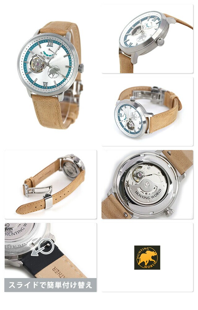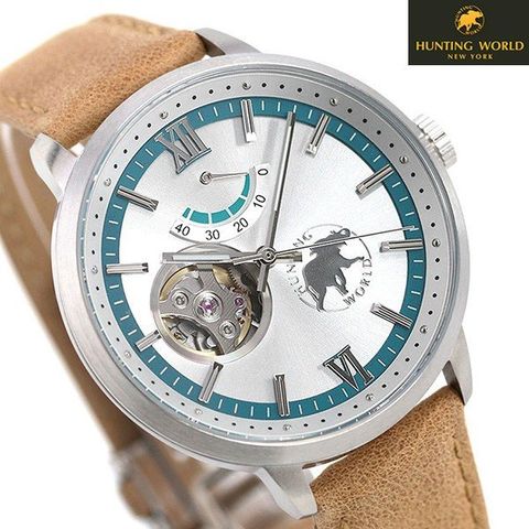 正規品 ハンティングワールド ビートエモーション 40mm オープンハート 自動巻き メンズ 腕時計 HW501BE HUNTING WORLD BEAT EMOTION アナログ シルバー×ベージュ 革ベルト ◆ハンティングワールドは1965年に設立。創立者であるロバート・M・リーは幼少期からの夢であったアフリカを訪れ、その魅力の虜となりサファリツアー会社を設立、環境保護にも取り組みました。その経験を元に、「LIVE THE ADVENTURE(冒険心)」の精神でバッグや雑貨、時計などを展開。装備類の快適さとデザイン性が人気を博しているアメリカのアパレルブランドです。 機械式時計の醍醐味「パワーリザーブ」を搭載したモデル。ローターの回転によって巻き上げられるメインスプリングの働きでムーブメントを40時間駆動し続けるパワーを蓄えることができます。ブランドロゴと並んで配置したオープンハートや裏ぶたからは自動巻きならではの動きを目で見て楽しむことができます。 機械式腕時計