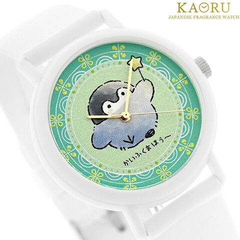 正規品 カオル コウペンちゃん×KAORU おうえんver -かいふくまほう- バニラの香り 日本製 レディース 腕時計 KAORU013W1 KAORU アナログ ライトグリーン ホワイト 白 ◆KAORU(カオル)は、日本の老舗香料メーカー、ゴムメーカー、時計メーカーがタッグを組んで作り上げた時計です。 日常の些細なことを肯定してくれる、コウテイペンギンのあかちゃん「コウペンちゃん」。いっぱいいて、どこにでもいる、可愛らしい仕草と優しい言葉に癒される素朴なタッチのアートは、SNSを中心に発信され一躍人気に。ファンに寄り添い癒してくれる身近な存在として浸透しているキャラクターです。