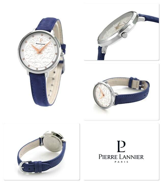 正規品 ピエールラニエ エオリア コレクション 33mm フランス製 クオーツ レディース 腕時計 P040J606 Pierre Lannier EOLIA COLLECTION アナログ シルバー×ネイビー 革ベルト ◆ピエール・ラニエ社は、1977年にフランス、ストラスブルグ市近郊に創設されました。「常に時代の最先端を駆けるファッション性の高い時計作り」をコンセプトに、多くのファンを魅了しています。 レースのカッティングが目を惹く文字盤のエオリア。インデックスにはジルコニアを使用。手元を華やかに彩ります。スライド式のベルトは、ご自分でのベルト調節が可能です。また、ベルト裏面のつまみのついたバネ棒をスライドさせるだけの操作でバンドの取り外し、取り付けが簡単に行えます。気分や服装にあわせてお手持ちのベルトと付け替え、お楽しみいただけます。