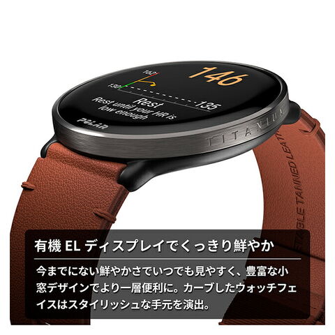 | 付属品 | 充電用USBケーブル、説明書 替えベルト付き(シリコンベルト/ブラック) 本体にはレザーベルト装着 |