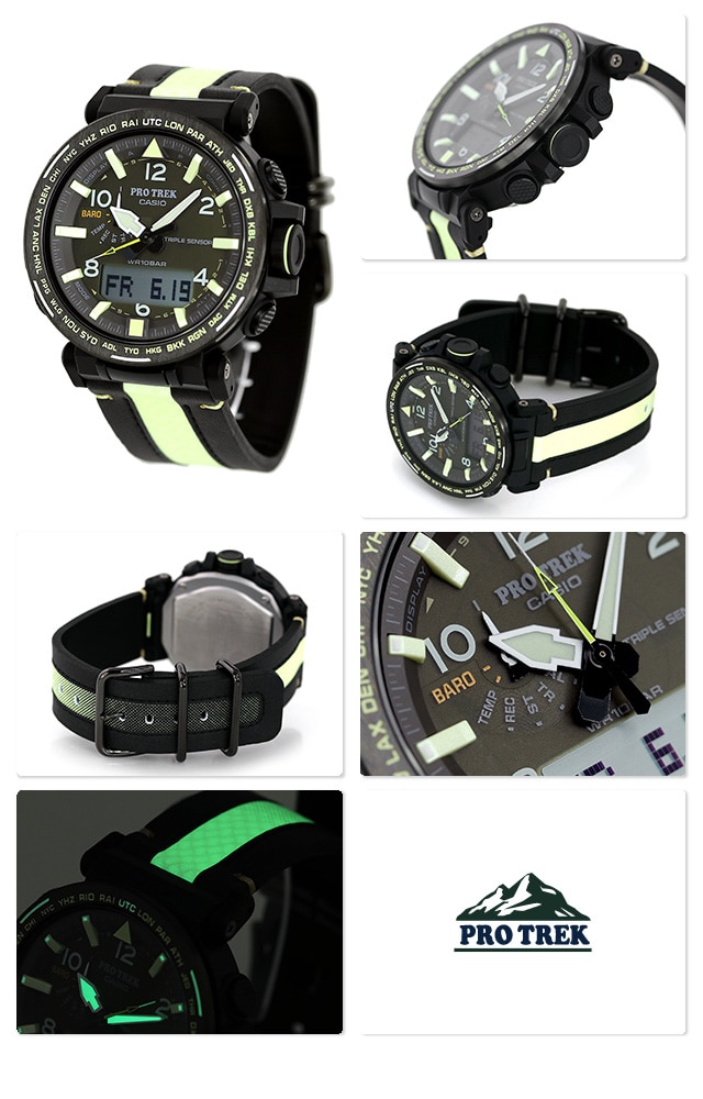 | 仕様 | ・10気圧防水 ・針位置自動補正機能 ・方位計測機能:16方位・方位の角度(0~359°)を計測、方位連続計測(60秒)、北方位指針機能、磁気偏角補正機能、方位補正機能 ・気圧計測機能(計測範囲:260~1,100 hPa)、気圧傾向グラフ(過去20時間分を表示)、気圧差インジケーター(±10 hPa)、気圧傾向インフォメーションアラーム(特徴的な気圧の変化が起こった場合に矢印と報音でお知らせします) ・高度計測機能/相対高度計(計測範囲:-700~10,000 m)、高度メモリー(計測年月日・時刻・高度を最大30本マニュアルメモリー、自動記録データ:最高/最低高度、オート積算(上昇/下降)メモリー)、高度傾向グラフ、高度差インジケーター(±100 m/±1,000 m)、計測間隔設定機能(5秒/2分毎)※最初の3分間のみ1秒毎 ・温度計測機能(計測範囲:-10~60 ℃) ・ワールドタイム:世界29都市(29タイムゾーン、サマータイム設定機能付き)+UTC(協定世界時)の時刻表示、UTCダイレクト呼出機能、ホームタイムの都市入替機能 ・ストップウオッチ(1/100秒、24時間計、スプリット付き) ・タイマー(セット単位:1分、最大セット:60分、1秒単位で計測) ・時刻アラーム5本・時報 ・針退避機能(手動、自動(高度、気圧、温度計測時)) ・バッテリーインジケーター表示 ・パワーセービング機能(暗所では一定時間が経過すると表示を消し運針を停止して節電します) ・フルオートカレンダー ・12/24時間制表示切替 ・耐低温仕様(-10℃) ・操作音ON/OFF切替機能 ・ダブルLEDライト: ・文字板用LEDライト(フルオートライト、ネオンイルミネーター、残照機能、残照時間切替(1.5秒/3秒)付き)、 ・LCD部用LEDバックライト(フルオートライト、残照機能、残照時間切替(1.5秒/3秒)付き) ・ネオブライト ・ねじロック式りゅうず |