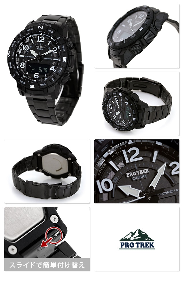 7年保証キャンペーン カシオ プロトレック PRT-B50 シリーズ 方位 気圧 高度 温度 歩数 Bluetooth スマートフォンリンク モバイルリンク メンズ 腕時計 PRT-B50YT-1DR CASIO PRO TREK PRT-B50 SERIES アナデジ オールブラック ◆方位、気圧、高度、温度、歩数の4つの計測が可能なクワッドセンサーに加え、スマートフォンリンク機能を搭載したPRT-B50から、軽量で錆びにくく、金属アレルギーを起こしにくいチタンバンドを採用したモデルが登場。バンドにブラックIP処理を施し、ケースと文字板の液晶部もブラックに。全体を黒基調のモノトーンで仕上げることで高い視認性と精悍なデザインを実現しました。立体文字板には大型アラビック時字を配し、視認性を向上。メタルパーツと組み合わせることでバリュー感のある仕上げにしています。また、ボタンの誤作動を防ぐボタンガードを配し時計の堅牢性を強化。アウトドアシーンでグローブをしながらでも操作できるよう採用した大型回転ベゼルが、ワイルドで屈強な印象を与えます。 国内モデル品番:PRT-B50YT-1JF