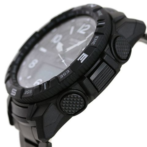 | 仕様 | ・10気圧防水 ・モバイルリンク機能(対応携帯電話とのBluetooth通信による機能連動) ・針退避機能(針が液晶表示と重なって見づらいときは、針を液晶表示の上から一時的に退避させることができます) ・方位計測機能:16方位・方位の角度(0~359°)を計測、方位連続計測(60秒)、北方位指針機能、磁気偏角補正機能、方位補正機能(2点補正/8の字補正/自動補正) ・気圧計測機能(計測範囲:260~1,100hPa)、気圧傾向グラフ(過去20時間または56時間分を表示)、気圧差インジケーター(±10hPa)、気圧傾向インフォメーションアラーム(特徴的な気圧の変化が起こった場合に矢印と報音でお知らせします)※気圧傾向グラフは過去20分または56分の表示に変更することができます。その際の気圧差インジケーターは±1hPa単位で表示します。 ・高度計測機能/相対高度計(計測範囲:-700~10,000m)、高度メモリー(計測年月日・時刻・高度を最大14本マニュアルメモリー、自動記録データ:最高/最低高度、オート積算(上昇/下降)メモリー)、高度傾向グラフ、高度差インジケーター(±100m/±1000m)、計測間隔設定機能(5秒/2分毎)※最初の3分間のみ1秒毎 ・温度計測機能(計測範囲:-10~60℃) ・歩数計測機能(歩数表示範囲:0~999,999歩)、パワーセービング機能(一定時間動きが無いと自動的にセンサーをスリープ状態にし節電) ・日の出・日の入時刻表示 ・ワールドタイム:世界38都市(38タイムゾーン、サマータイム自動設定機能付き)+UTC(協定世界時)の時刻表示、ホームタイムの都市入替機能 ・ストップウオッチ(1/100秒(1時間未満)/1秒(1時間以上)、24時間計、スプリット付き) ・タイマー(セット単位:1分、最大セット:24時間、1秒単位で計測) ・時刻アラーム5本・時報 ・フルオートカレンダー ・12/24時間制表示切替 ・耐低温仕様(?10℃) ・操作音ON/OFF切替機能 ・ダブルLEDライト: ・文字板用LEDライト(オートライト、ネオンイルミネーター、残照機能、残照時間切替(1.5秒/3秒)付き)、 ・LCD部用LEDバックライト(オートライト、スーパーイルミネーター、残照機能、残照時間切替(1.5秒/3秒)付き) ・方位ベゼル |
