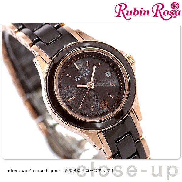 正規品 7年保証キャンペーン ルビンローザ R310シリーズ 28mm ソーラー レディース 腕時計 R310PBR Rubin Rosa R310 Series アナログ ブラウン×ピンクゴールド ◆ルビンローザ(Rubin Rosa)は「もっと、輝く私になる。」をコンセプトに、自分らしさを楽しみながら輝く女子を応援。手頃で可愛らしい時計やジュエリーを展開しています。 ルビンローザの時計はすべて“ソーラーチャージ”方式の国産ムーブメントを搭載。文字盤に仕込んだソーラーセルが日々の中で受けるいろんな「光」を感知し、電気エネルギーに変換・蓄電します。定期的な電池交換の必要がないからとってもエコ!電池切れで急に止まるなどの心配も無く、デイリー使いにぴったりな腕時計です。 小さめのケースサイズとシンプルなデザインがポイント。チョコレートのような滑らかな光沢のセラミック素材はリッチな印象でコーデをクラスアップします。プレゼントにもおすすめです。