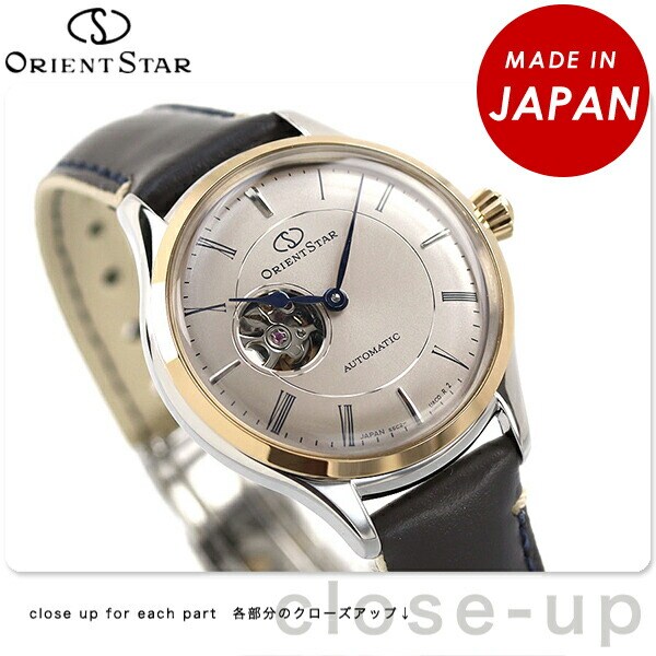 正規品 7年保証キャンペーン 送料無料 オリエントスター クラシック セミスケルトン 森の木漏れ日 日本製 自動巻き レディース 腕時計 RK-ND0011N ORIENT STAR Classic Semi Skeleton アナログ パールグレー×グレー 革ベルト ◆「やさしいひかり」をデザインコンセプトにしたモデルが登場。変わらない日常や自然の景色から感じる穏やかな幸福感を、ナチュラルで淡いトーンのカラーダイアルで表現しました。文字盤の中央部分と9時位置のセミスケルトン部分にはダイヤカットを施し、大小のひかりの輪の重なりを表現。また、やわらかな曲線を描くボックスガラスやボンベ文字盤を組み合わせることで、クラシカルな印象を与えるデザインに。ベルトには横から見た時にも表面・裏面両方の素材が見える、フランス仕立てのベルトを採用し、クラシカルなデザインを引き立てる、雰囲気のある仕上がりを実現。台形形状により操作性を高めたりゅうずにはラインストーンをセットし、側面から見た時にもエレガントな表情を演出します。 発売日:21年9月発売 機械式腕時計 Made in Japan