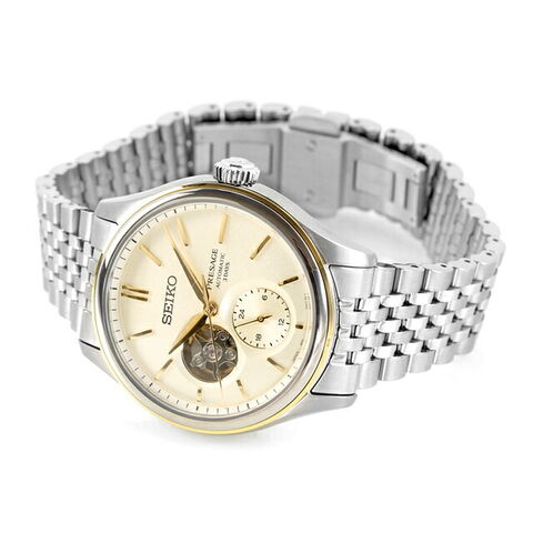 正規品 7年保証キャンペーン 送料無料 セイコー プレザージュ 素色 コアショップ専用モデル 流通限定モデル オープンハート 日本製 メンズ 腕時計 SARJ010 SEIKO PRESAGE Classic Series アナログ オフホワイト 白 ◆日本のものづくりに込められた伝統的な感性と洗練されたエレガンスを備えた、正統かつ普遍的なウオッチコレクション「クラシックシリーズ」から新モデルが登場。ダイヤルカラーは古来より愛されてきた和服の染色の伝統色の一つである、生地の素材そのものの色を表す素色を採用。更に高貴さや神聖さを象徴し、祝い事の際にも使用されることの多い、金色を取り入れることで、エレガントかつクラシックなケース造形を一層際立たせます。ダイヤルはクラシックな雰囲気を演出するため立体的に成形したダイヤルを採用。針やインデックスをダイヤルの曲面に合わせてカーブさせることで、ダイヤル全体が柔らかな光で輝きます。 発売日:2025年1月発売 機械式腕時計