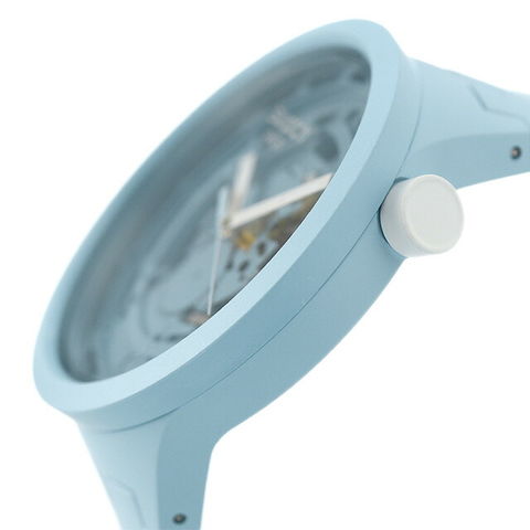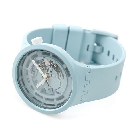 3年保証キャンペーン スウォッチ バイオセラミック C-BLUE スイス製 クオーツ メンズ 腕時計 SB03N100 SWATCH BIOCERAMIC アナログ ブルー ◆個性と実用性を兼ね備えたスイスウォッチ、「swatch(スウォッチ)」。少ない部品による単純構造というコンセプトと、それに伴う防水性を確保させる構造が大きな鍵となった。答えとして選んだ姿は、ケースを一体化させる形。今やスウォッチといえば、オシャレな雑誌などで紹介され、コアなファンも多く、日本でも幅広い人に愛されています。 革新的でユニークなBIOCERAMIC(バイオセラミック)は、ピュアで高度に計算されたデザイン。柔らかくてシルクのようなタッチ、抵抗力、弾力性を表現します。大胆なスカイブルーのムーブメント、未来をお楽しみください。透明なダイヤルがポイント。また、少し大き目のサイズがお好みの女性まで、幅広い方々の手首にフィット。男女問わずお使いいただけ、プレゼントにもおすすめです。