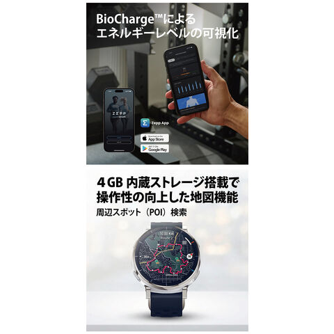 | 仕様 | ・5ATM防水 ・バッテリー -容量:365 mAh -方法:マグネット充電 -想定充電時間:2時間 -通常使用:最大12日間 -ヘビー利用:最大7日間 -GPSモード (単一周波数、複数衛星捕捉、サンプリングレート1秒):最大 24 時間 ・センサー -BioTrackerTM 6.0 PPG 生体センサー (5PD + 2LED) -6軸加速度センサー, 6軸ジャイロスコープ, 温度センサー, 環境光センサー, 地磁気センサー, 気圧高度センサー -Bluetooth 5.3 BLE -6衛星測位システム (GPS, GLONASS, Galileo, BeiDou, QZSSみちびき, NaviC) 円偏波GPSアンテナ ・ディスプレイ -素材:AMOLED 3,000Nit -サイズ:1.32” -解像度:466 x 466 -1 inch あたりのPixel数:353 ・マイク機能 ・リニアモーター ・スピーカー ・Android 7.0 以上, iOS 14.0 以上 ・Zepp App |