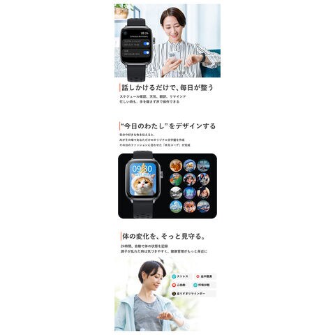 | 付属品 | 時計本体(純正バンド含む) 専用充電ケーブル、ユーザーマニュアル 替えベルト付き(シリコン/ホワイト) |